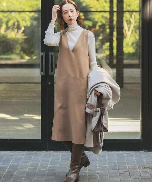 オン・オフ着こなせる万能ワンピース。コーディネートのインナーにはタートルネックや綺麗めブラウスがおすすめ。上品な印象で、特別な日の一枚にも活躍してくれるアイテムです。