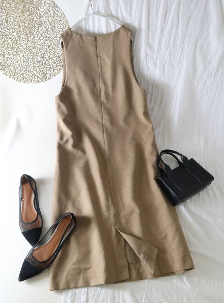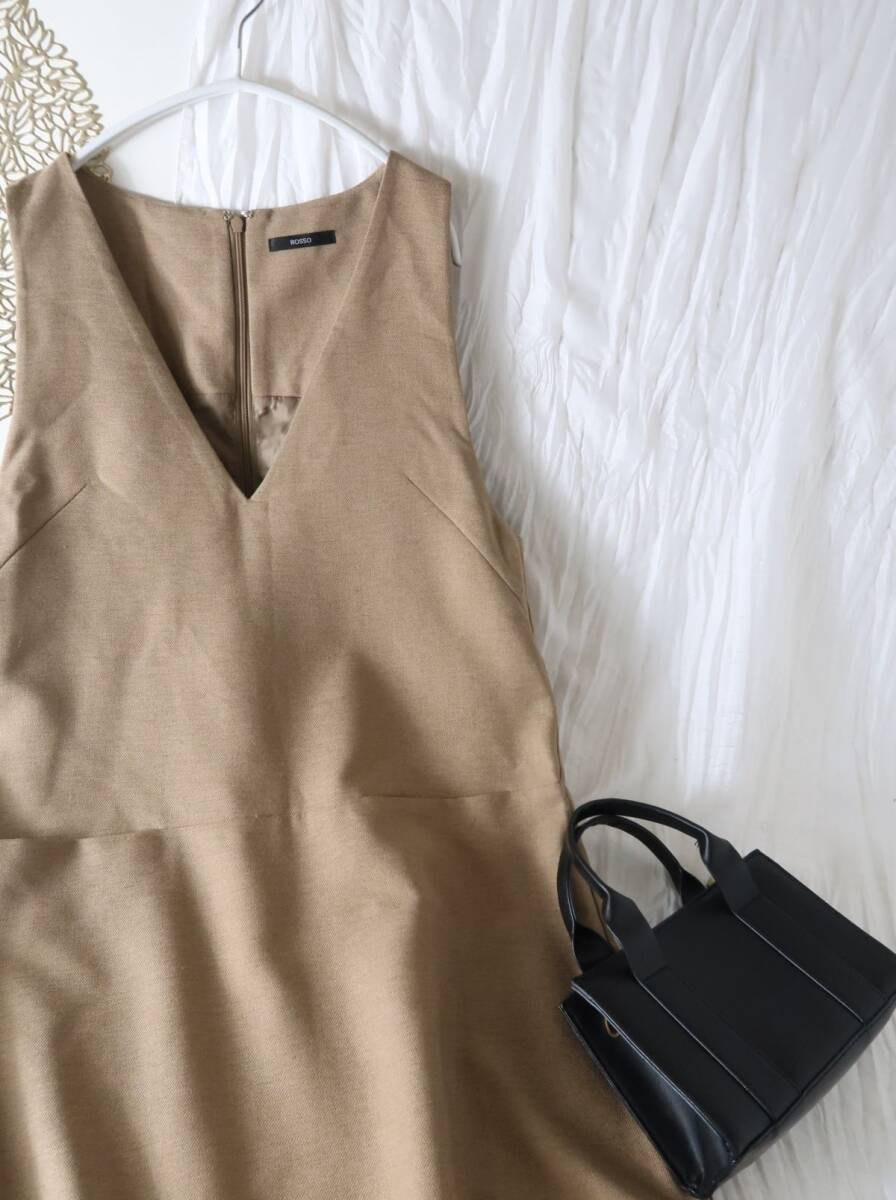 すっきりとしたAラインのシルエットが魅力。ミニマルなデザインに、深めのVネックが女性らしさを演出します。
