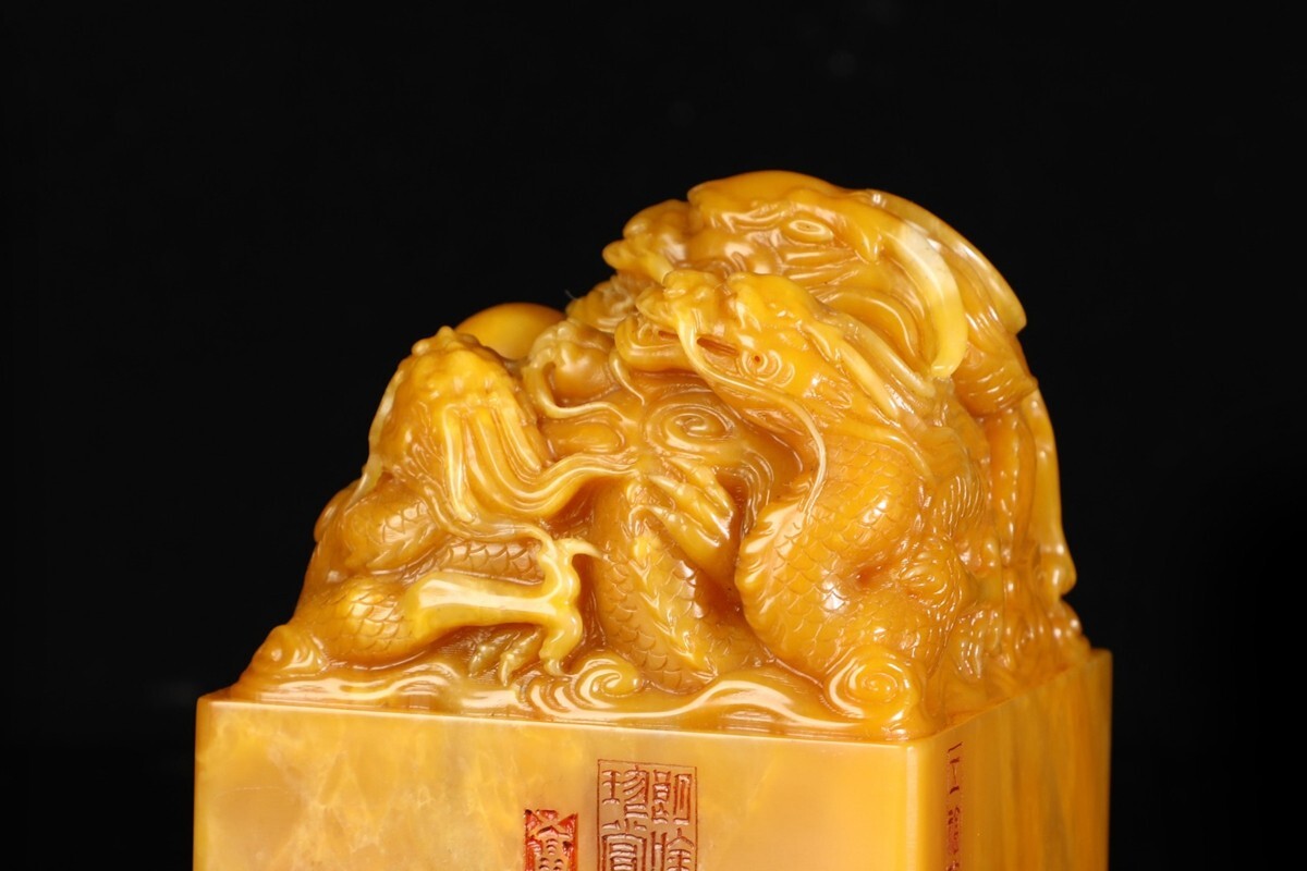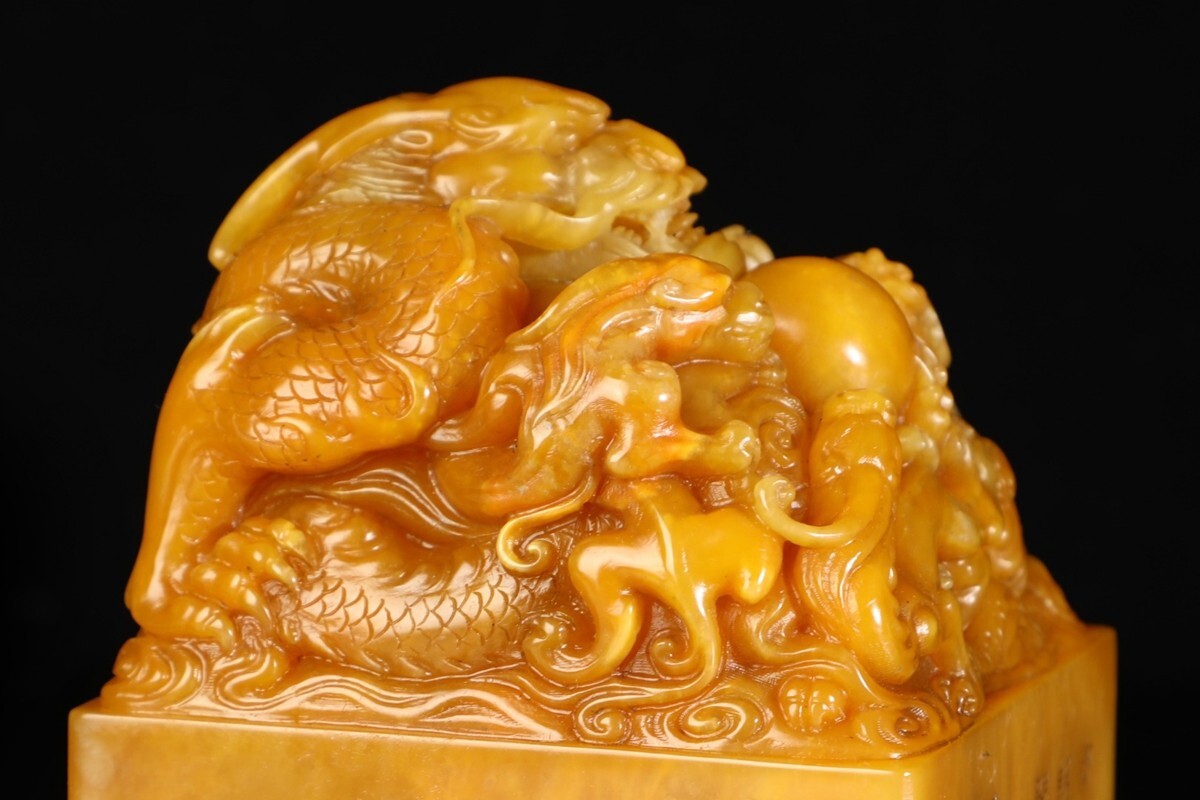 「清時代 老寿山石 田黄石彫り 五龍戲珠 印章」極細工 擺件 古賞物 中国古美術 旧蔵出