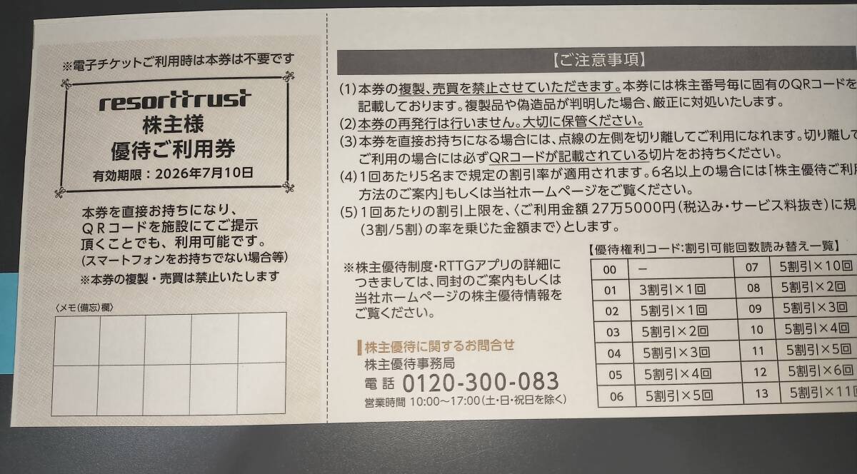 【送料込】リゾートトラスト 株主優待券 3割引 ×1枚 有効期限:2026年7月10日 男性名義