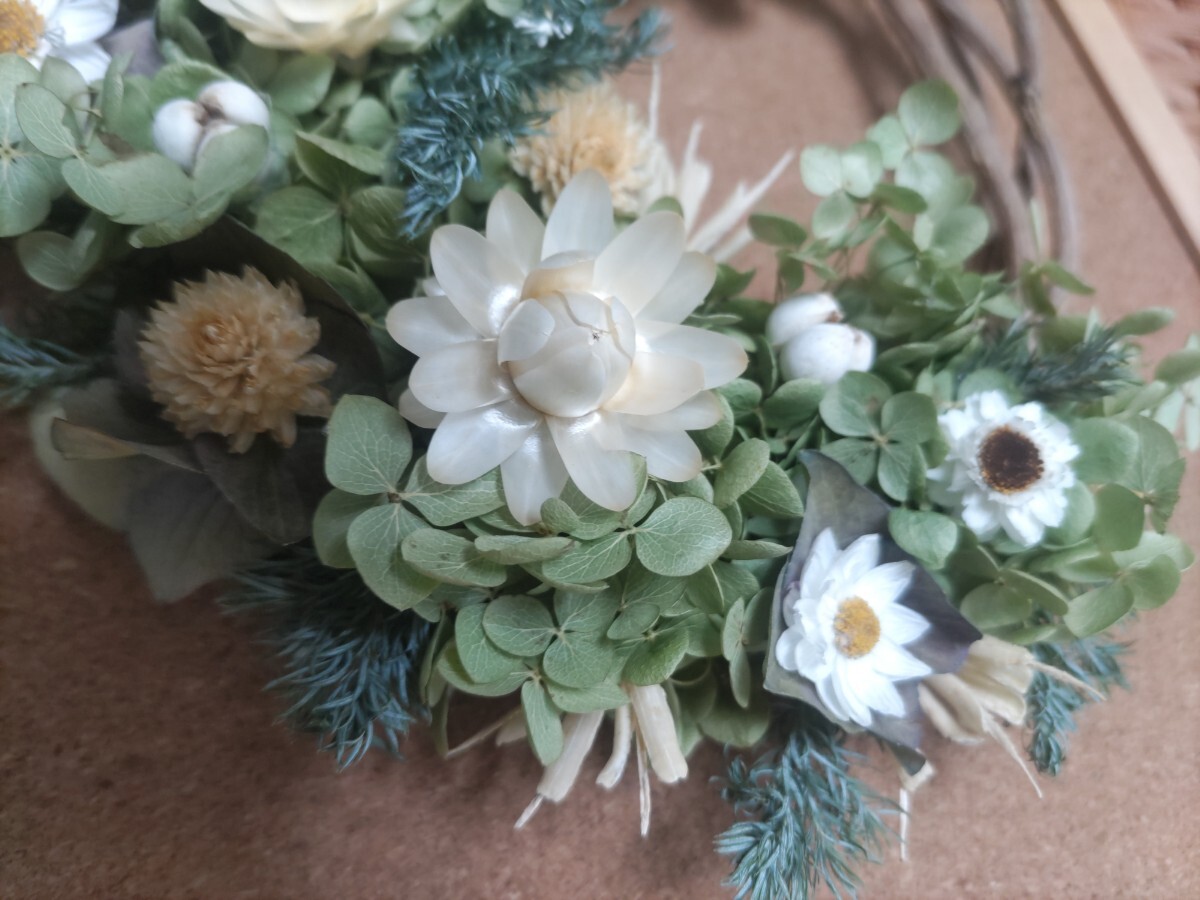 今季乾燥仕立ての北海道産 アナベルをベースに様々な色合いの花材が使われており、お部屋のインテリアとして壁に飾るのにぴったりです。