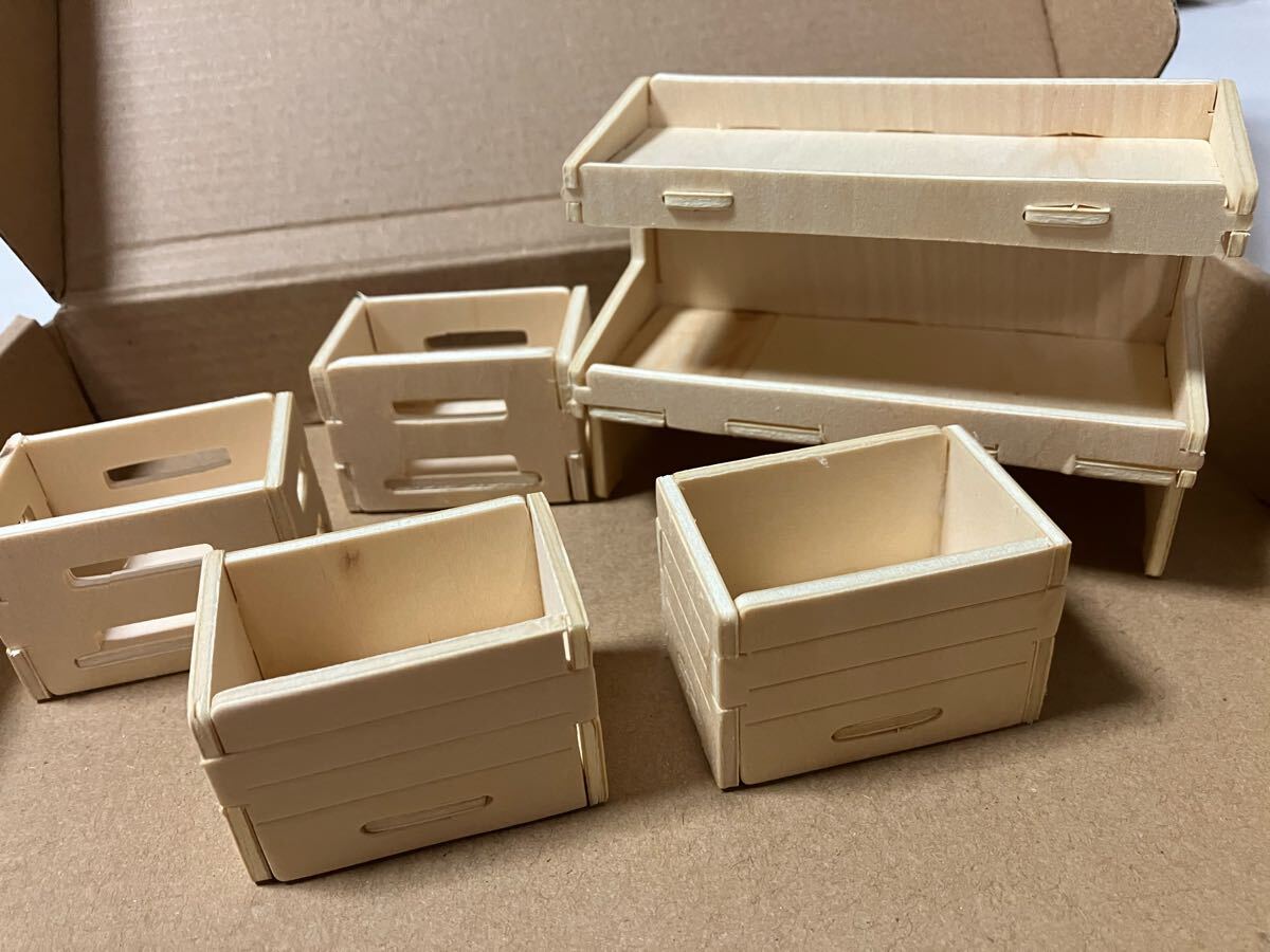 ドールハウス用のミニチュア家具、ハンドメイド 木箱2つ ボックス2つと陳列棚 お酒屋さんセット 木製の飾り棚と小物入れのセットです。コレクションのディスプレイや、ドールハウスのインテリアに最適です。