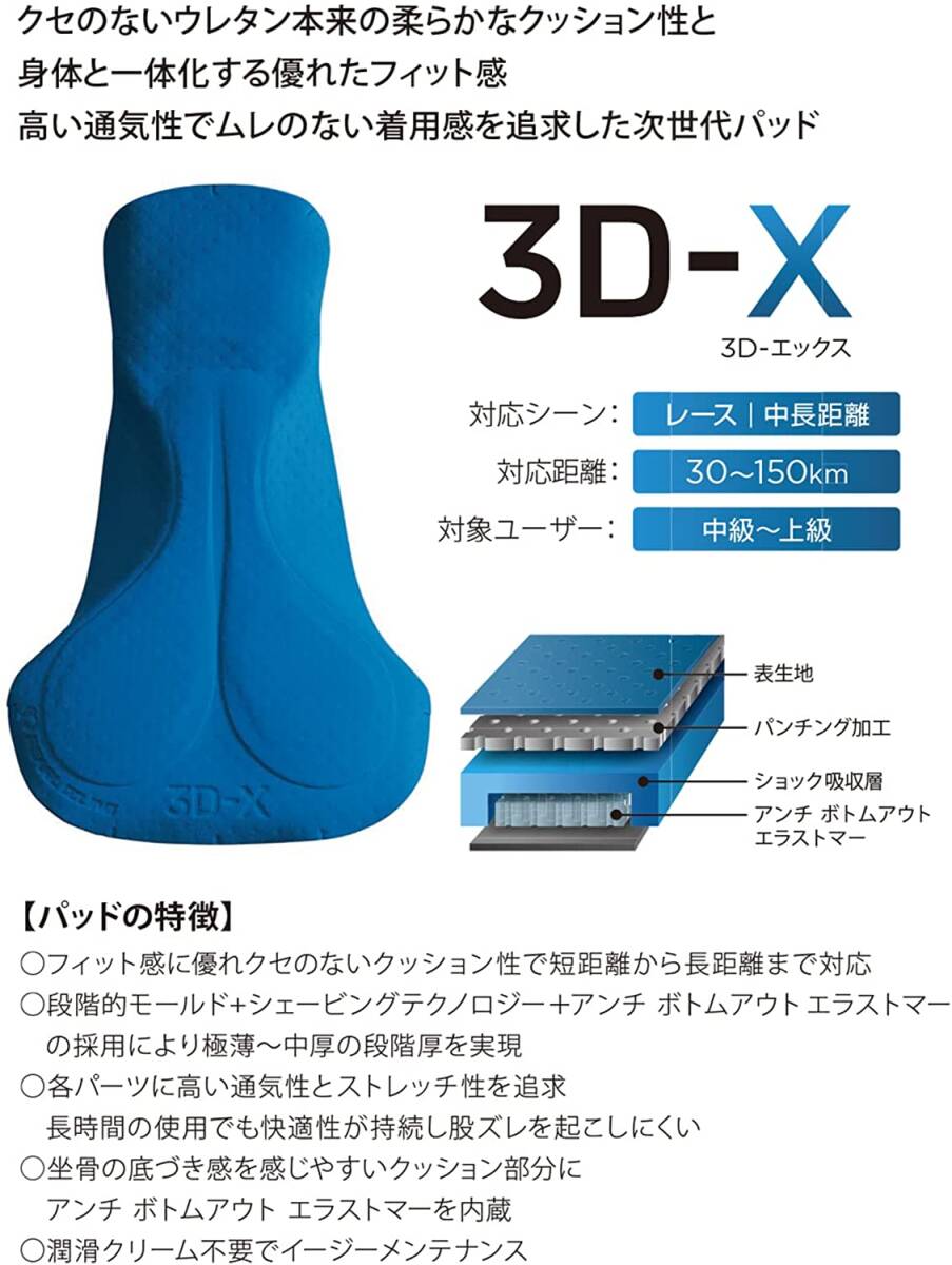 風を受ける前面には防風性と保温性と動きやすさを兼ね備えた素材「ウィンドブレーク」を採用した5℃対応モデルです。優れた透湿機能で、ムレや汗冷えを軽減します。パッドは身体と一体化するより高いフィット感と柔らかなクッション性を両立させた最新モデル「3D-エックス」を装備。最新技術のスラロームクランクカットを採用することにより、ペダリング動作がより快適になりました。
