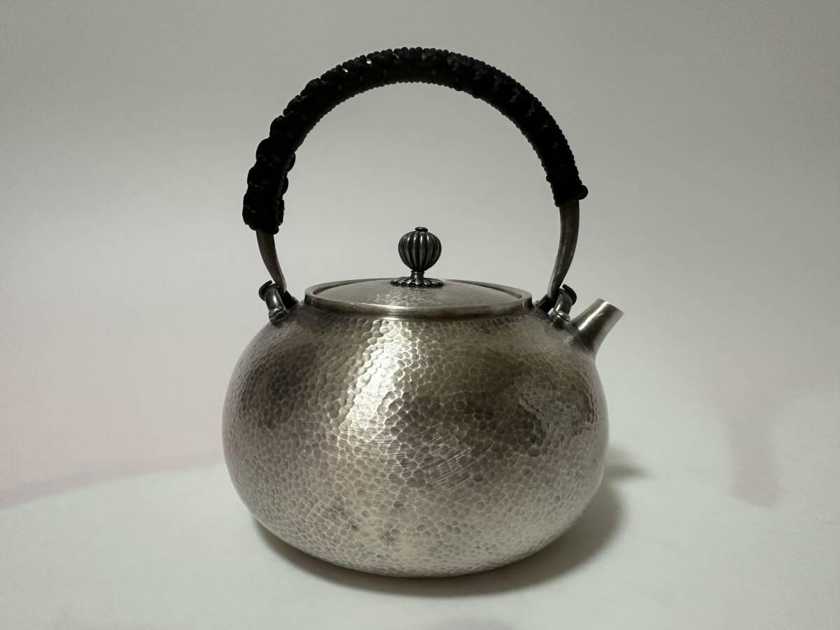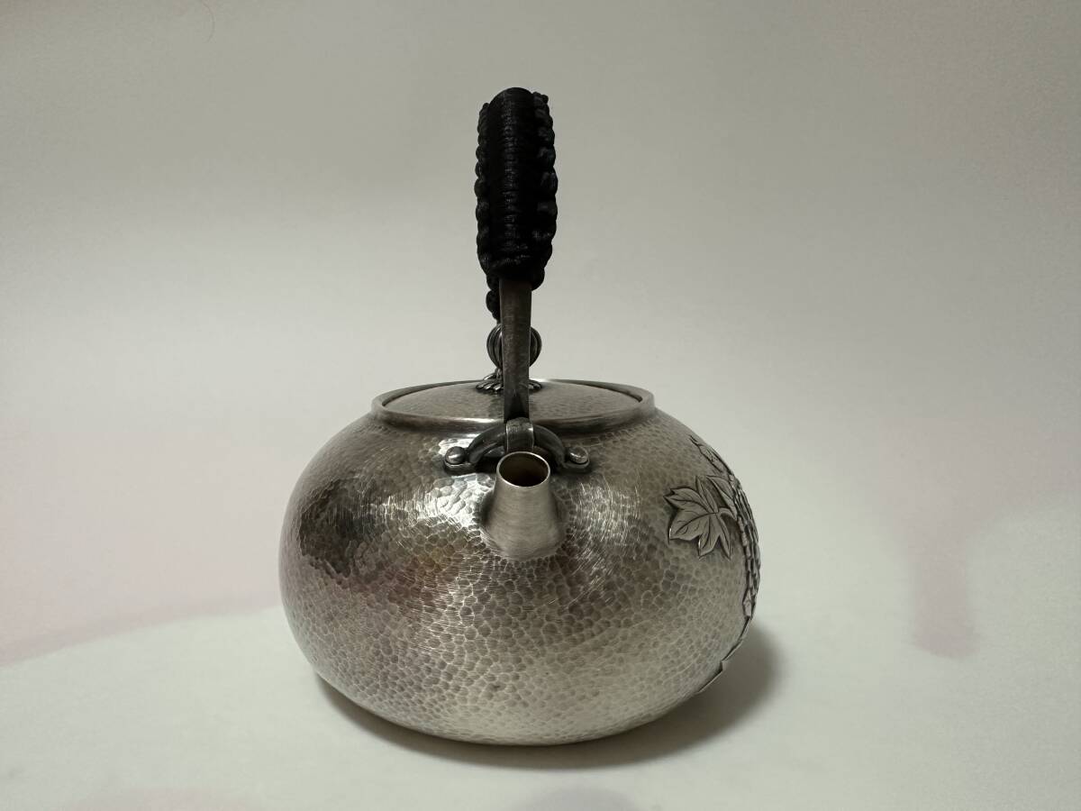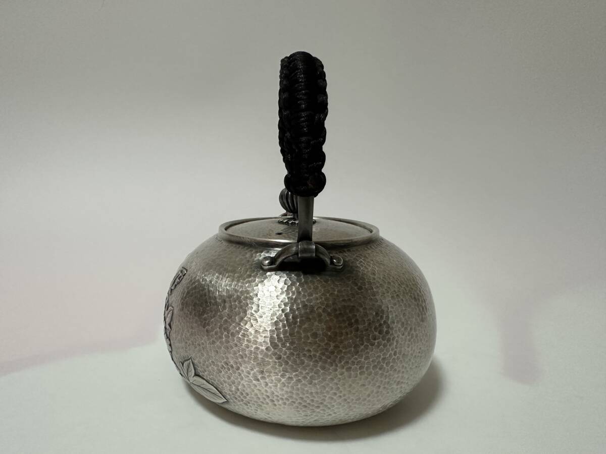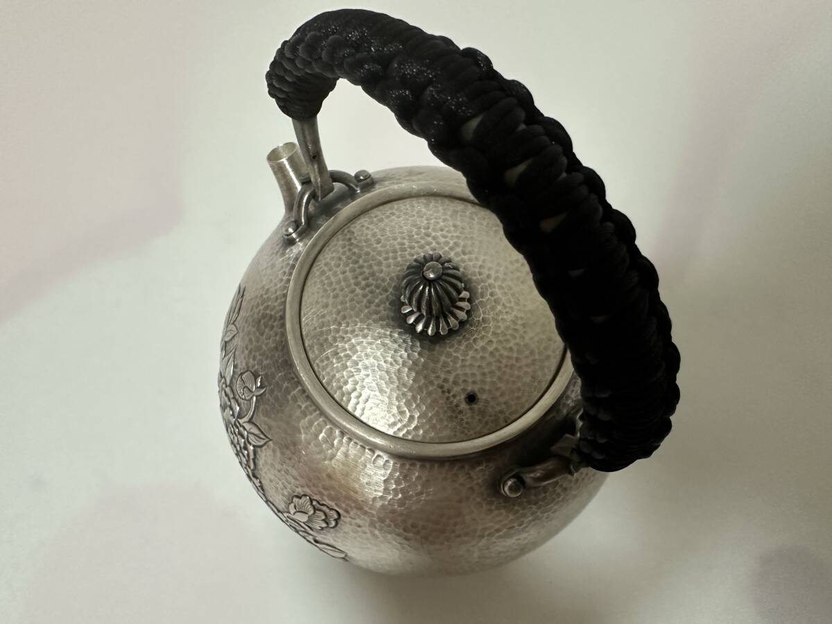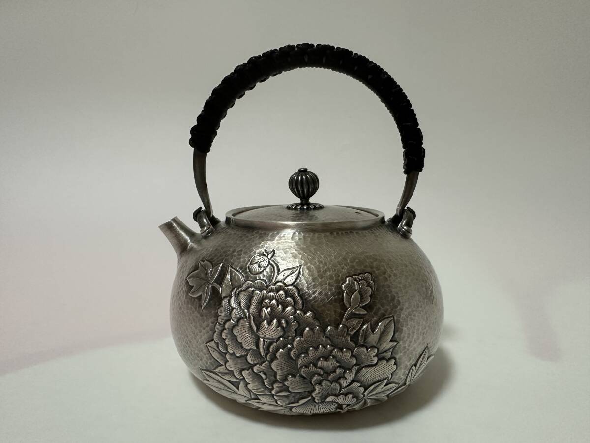 時代 純銀製 中川浄益造 牡丹彫り 宝珠形 湯沸 工芸品 古美術品 銀瓶 煎茶道具