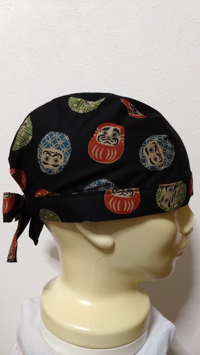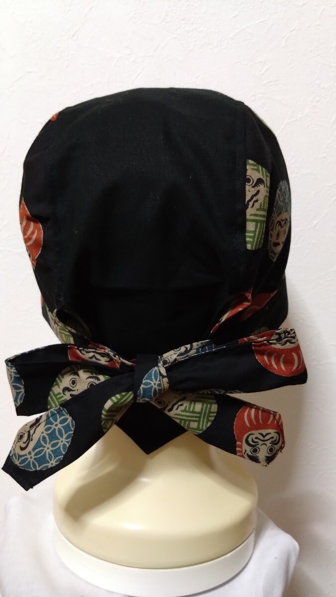 短★バンダナキャップ★ハンドメイド 和柄 ダルマ×無地 だるま 黒