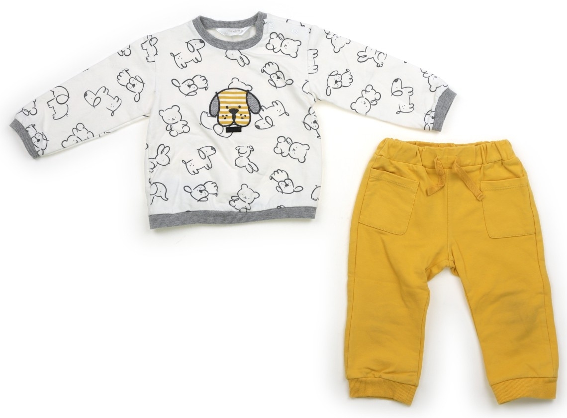 実際のサイズ表記は74cm。裏微起毛。薄手のスウェットの上下セット。上の品質タグが取れかけています。パンツの膝が薄汚れています。上下とも洗いざらし感がありますが、まだまだ普段着として活躍してくれそうです。