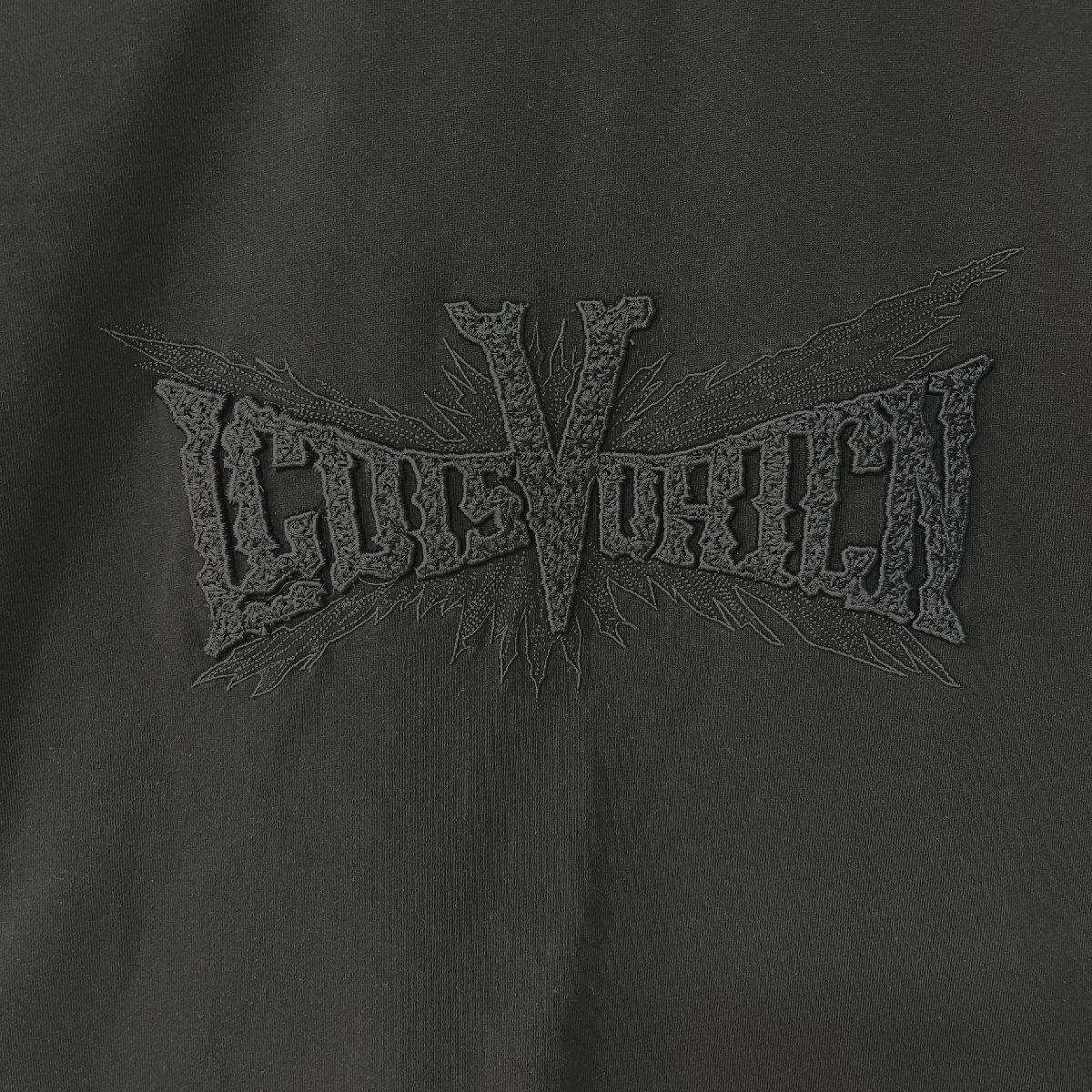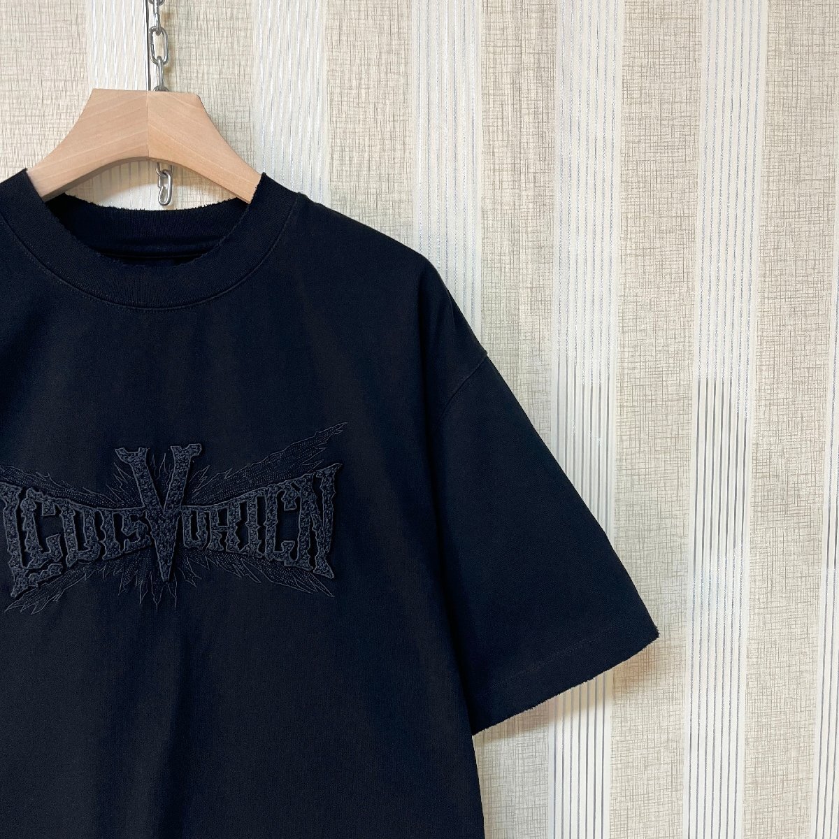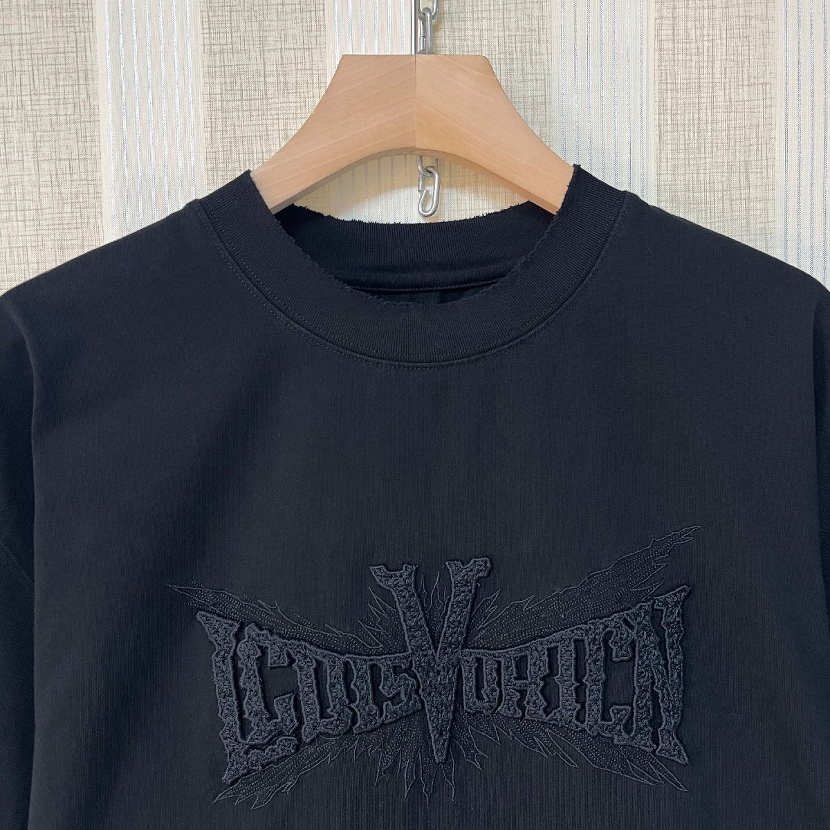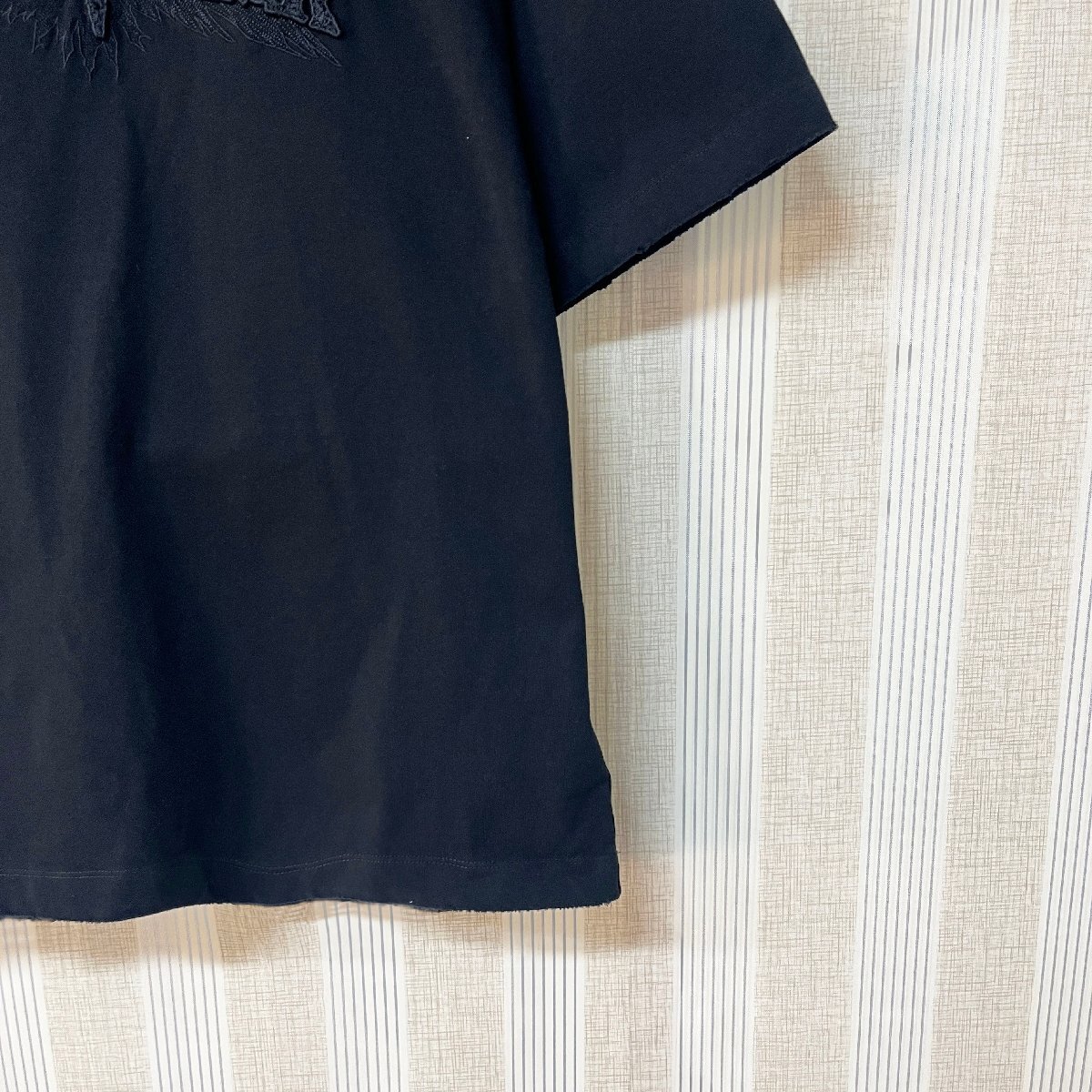 フロントの英字刺繍は同色糸を使用し、さり気ないキラキラ感と凹凸感のが魅力。控えめながらも上品なアクセントを添えてくれます。襟ぐり狭めのラウンドネックとしっかりとした生地感で、清潔感ある大人カジュアルスタイルを構築します。