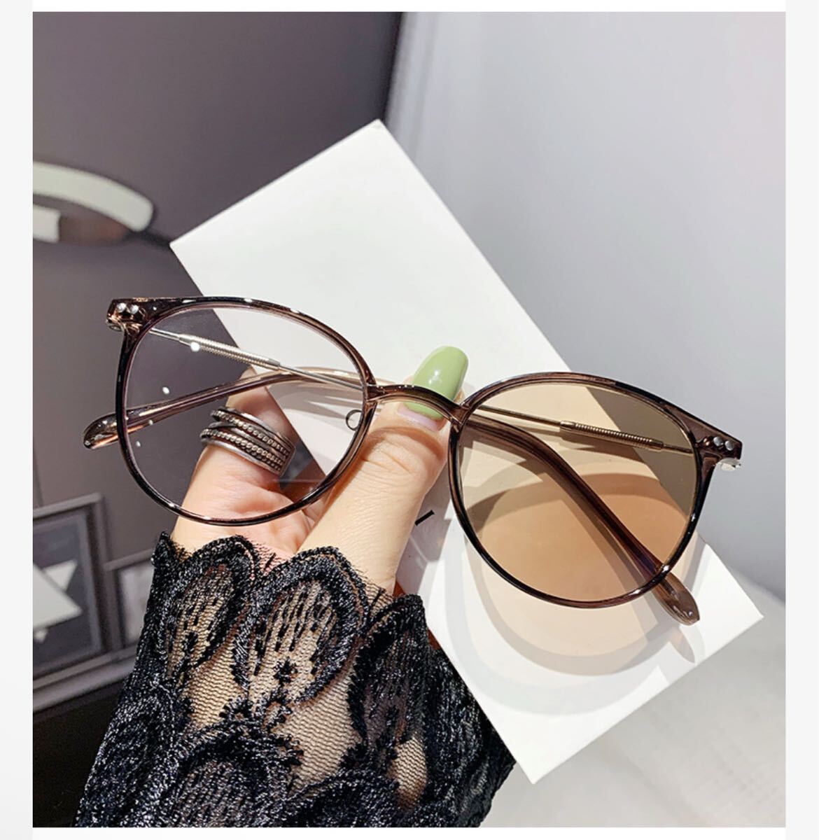 室内ではクリアレンズの伊達メガネとして、屋外ではサングラスに変化します。