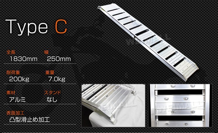 バイクから耕運機まで積み込める、軽くて丈夫なアルミブリッジです! 踏板部分に凸型滑止め加工済! 荷台への固定フック付で安全! 【仕様】 折りたたみ式 全長:1830mm(折りたたみ時:930mm) 幅:250mm 耐荷重:200kg/1本 ※耐荷重以上の重さでの使用は商品の耐久性が低下しますのでご注意ください。 重量:7.0kg 素材:アルミ ※写真と実物は多少異なる場合がございます。あらかじめご了承下さい。 |