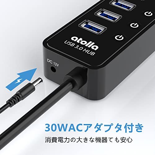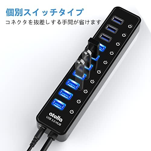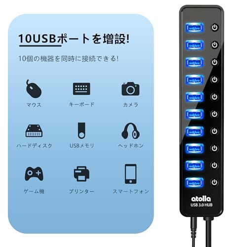 USB3.0ハブ 電源付き atolla USB ハブ 10ポート USBハブ セルフパワー/バスパワー USB Hub 5Gbps高速データ伝送 USB3.0 拡張 独立スイッチ付き 12V/2.5A ACアダプタ付き Android/Windows/MacBook/Mac/Surface Pro等システムとノートPC対応