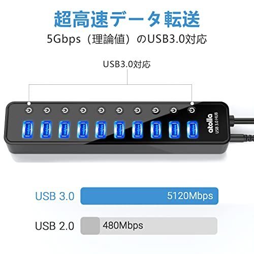 USB3.0ハブ 電源付き atolla USB ハブ 10ポート USBハブ セルフパワー/バスパワー USB Hub 5Gbp