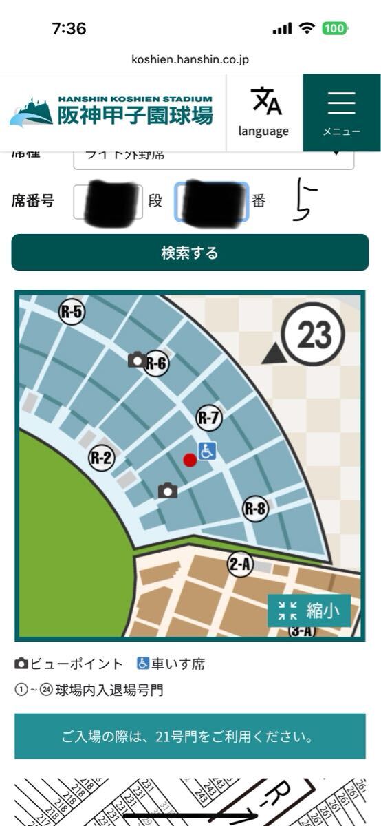 甲子園球場 ライトスタンド指定席 25段〜30段で264〜275番の4連番です。
