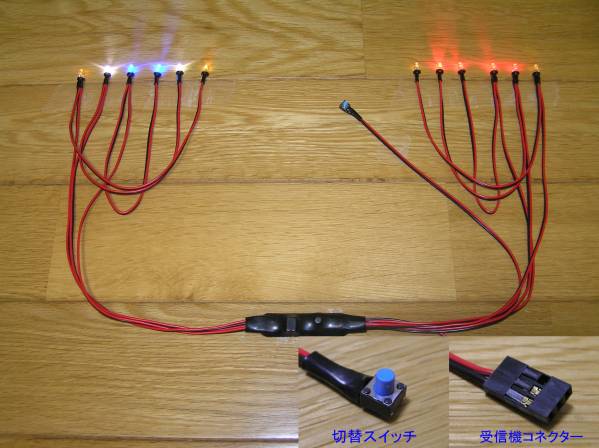 ・スイッチを押すとフロント6灯(青、白、黄)とリア6灯(赤 黄)が、全灯、点滅、フラッシュ等に8パターン変化します。