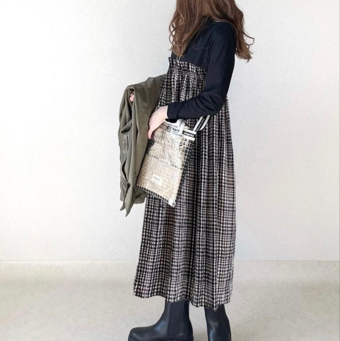 【~3L相当】重ね着風胸元ギャザーベアトップ風チェックワンピース | |||