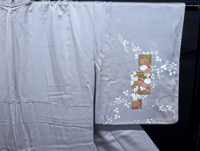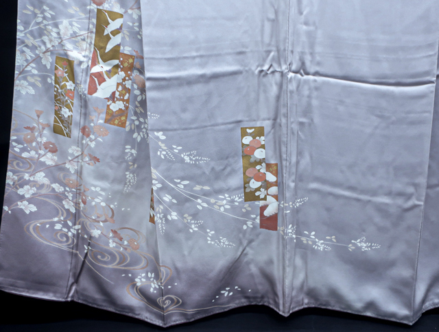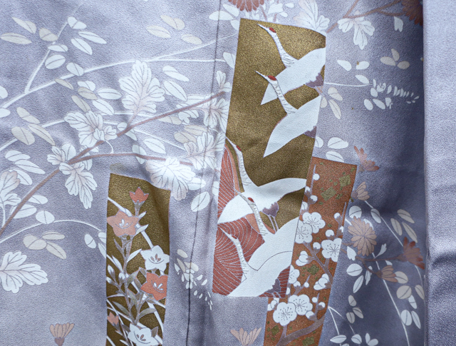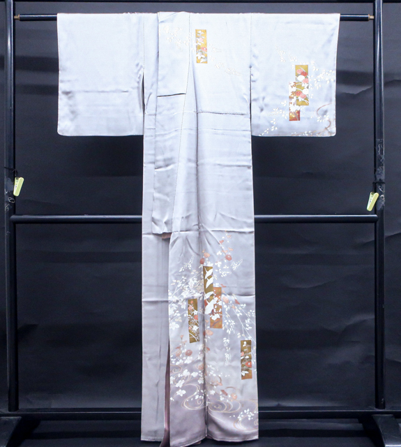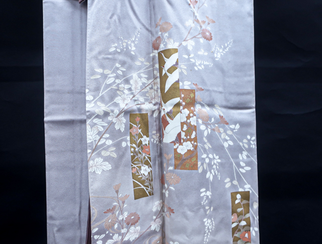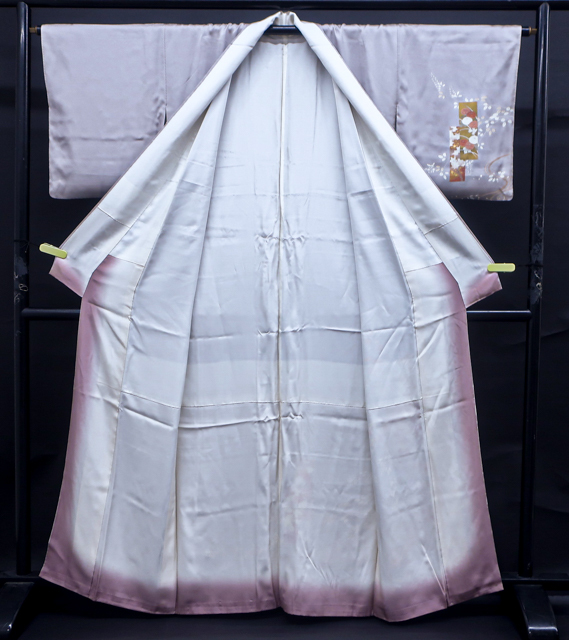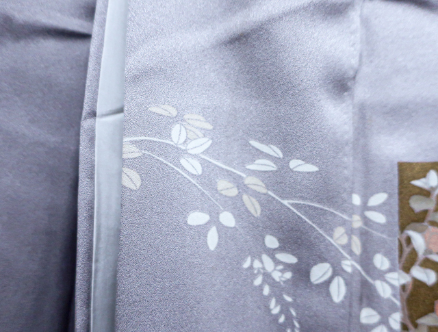 リサイクル商品のため、衿折れ山に薄汚れ、袖口辺りに薄ヤケや薄シミがございますが着用可能なお品です。 地色は、灰薄紫色です。 1枚目の画像が近いお色かと思われます。 素材は正絹です。 |