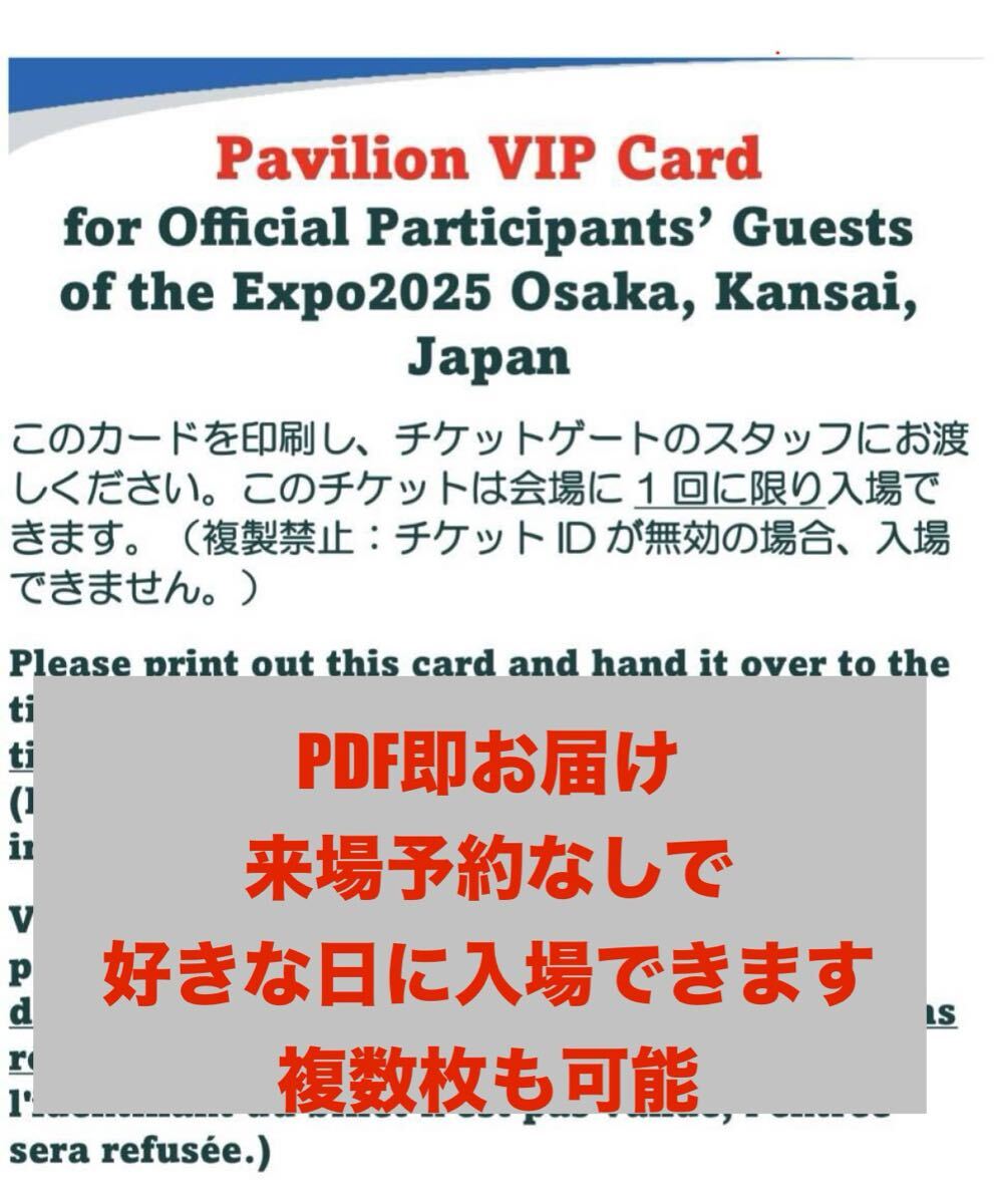 ※本パビリオンVIPカードは万博会場への入場でのみ有効です。会場へは入場できますが万博チケットIDは付属しておりませんので予約が必要なパビリオンへの入場予約はできません。万博チケットがなくともカードのみで万博会場に入場することが可能です。ただし特定パビリオンへの優先入場等は出来ません。ご理解のうえで落札ください。