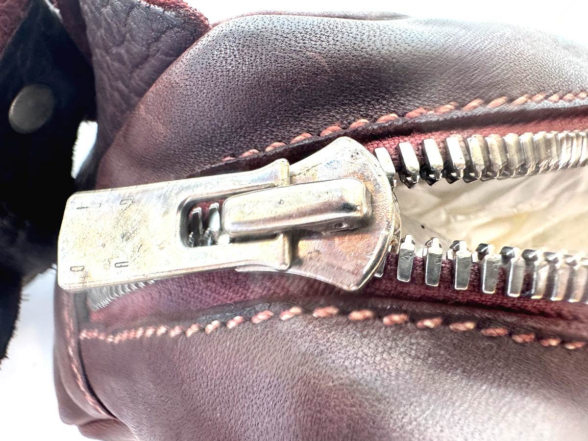シンプルな長方形フォルムながら、エッジ部分のステッチやジップの無骨なメタルパーツがGUIDIらしい存在感を放ちます。