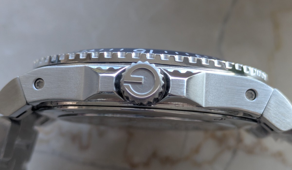 リューズには青い保護シールが貼られておりますので、剥がしてお使いください。