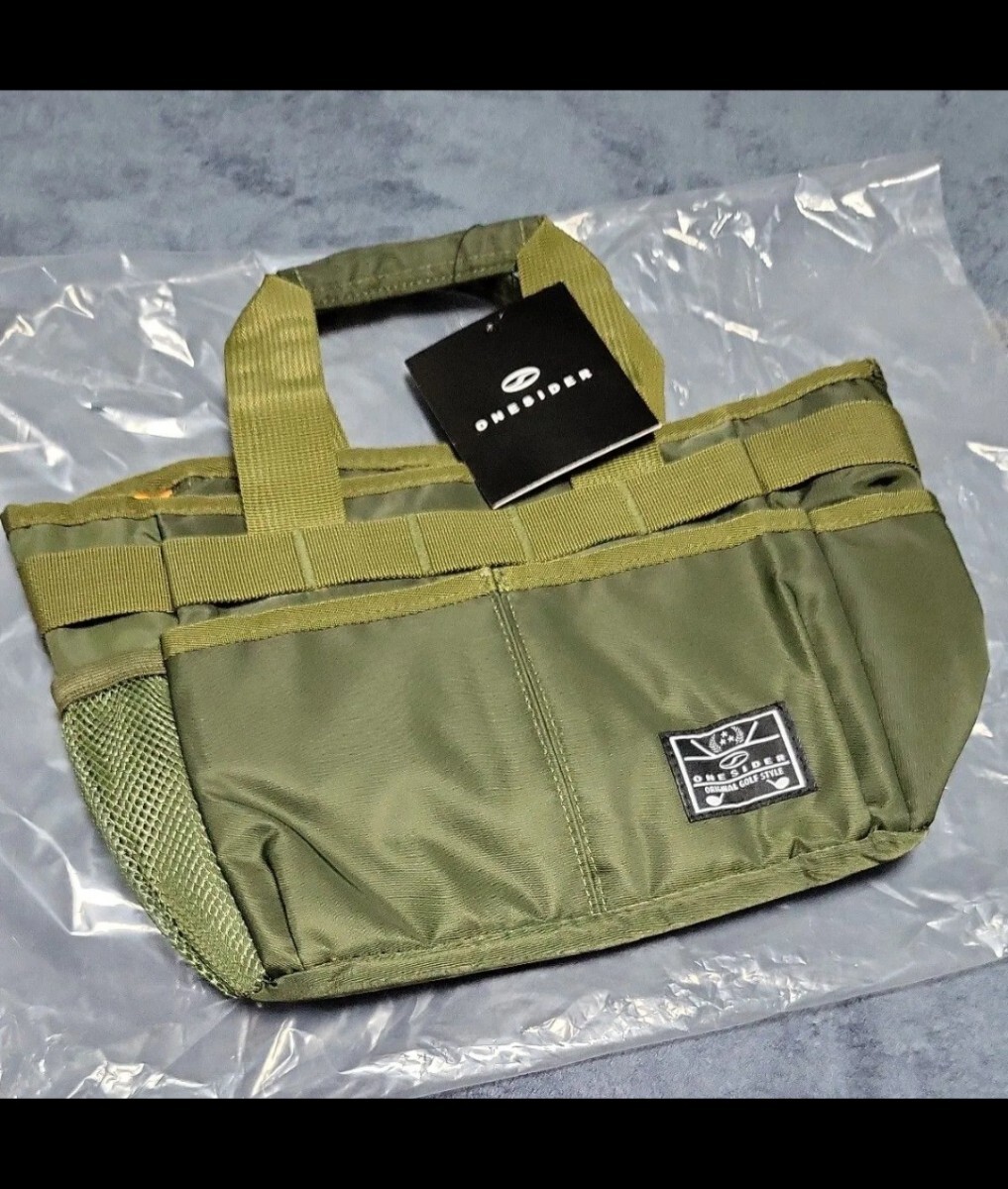 ONESIDERのゴルフ用カートバッグです。カーキ色で、複数のポケットが付いており、小物の収納に便利です。