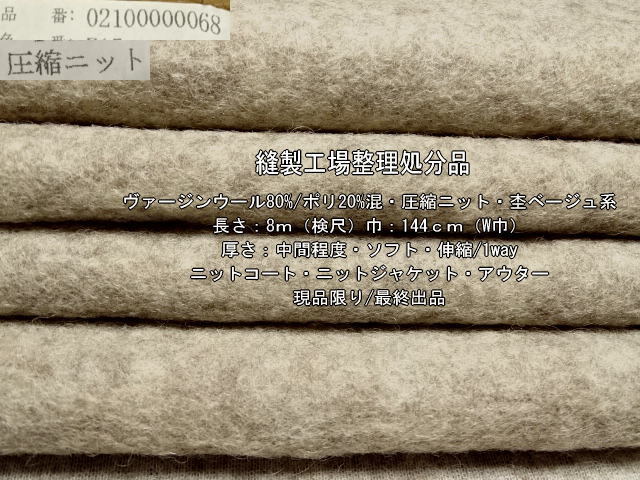 商品説明 | 縫製工場様からの整理・処分品の激安処分です。 商品知識は御座いませんが、大量の余財を処分させて頂きます。 商品は、ヴァージンウール80%/ポリ20%混・圧縮ニット 色調は、杢ベージュ系でございます。 長さは、8m(検尺)巾は、144cm(W巾)です。 厚さは、中間程度・ソフト・伸縮/1wayでございます。 ニットコート・ニットジャケット・アウターなどに いかがでしょうか。 現品限りの商品でございます。 この機会にお試し下さい。 |