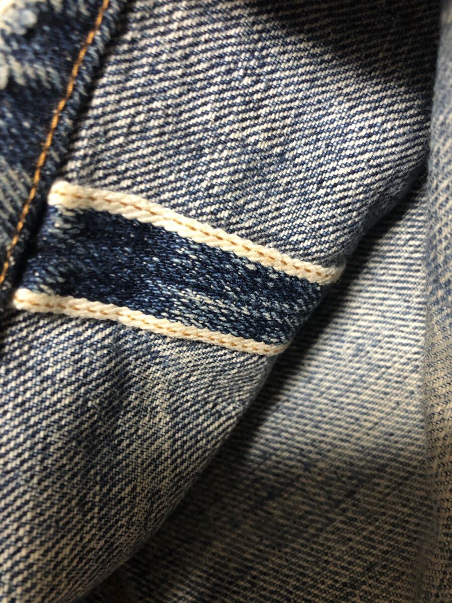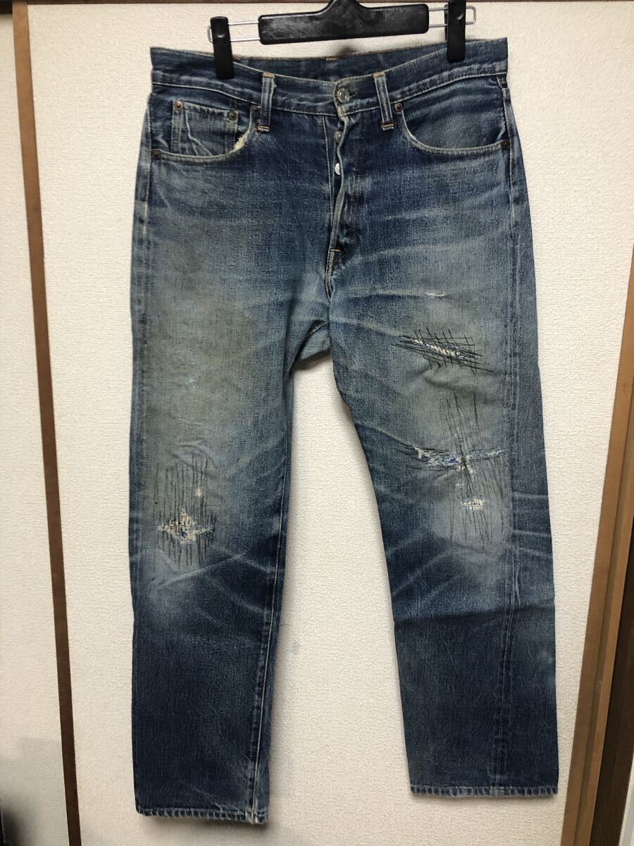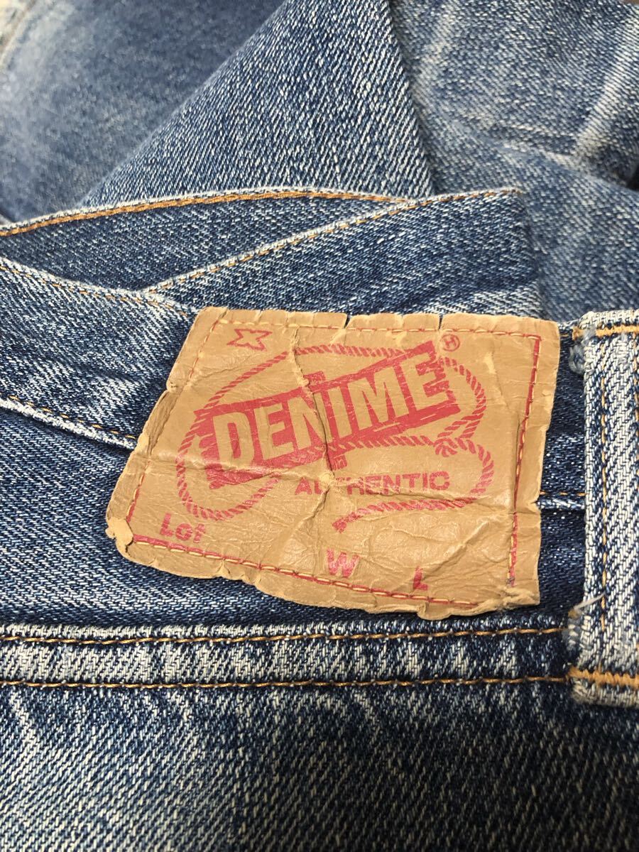ドゥニームのダメージリペア加工が施されたブルーデニムパンツ