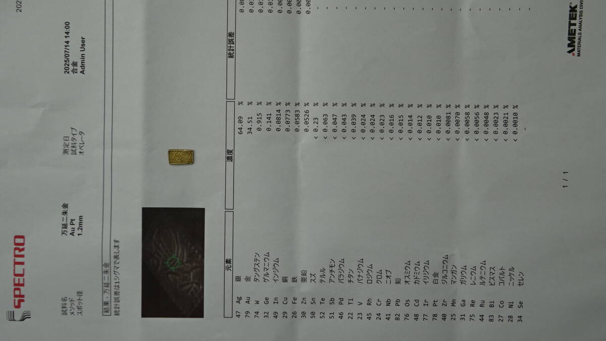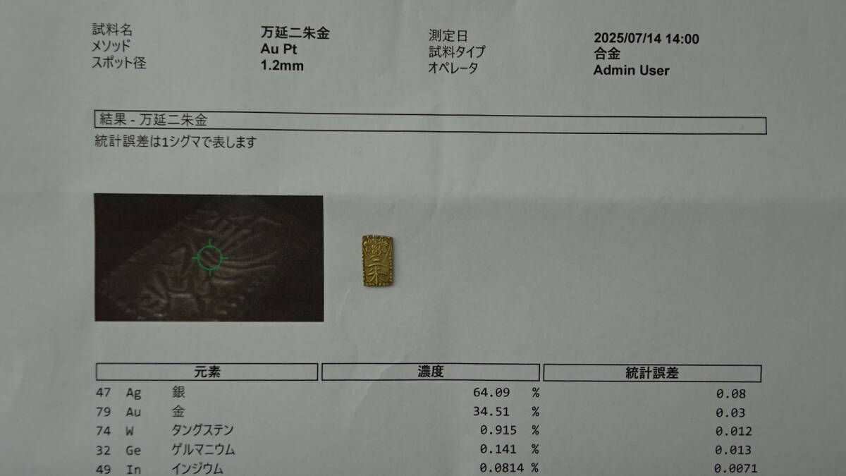 万延二朱金(カタログは万延二朱判金)です。最近の金の高騰で偽物が心配な方向けに成分分析表を取得しました。状態は美品です、画像判断もお願いします。また記事に間違いがあった場合は、画像優先でお願いします。不明な場合はご質問下さい。