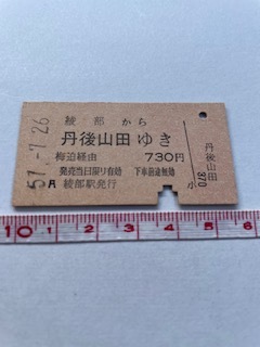 | ◎綾部駅発行 綾部から丹後山田ゆき 梅迫経由 730円 硬券乗車券 S.57.&58 店番-硬券196 | |