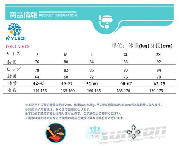 【商品説明】ウェットスーツ レディース ダイビング フルスーツ サーフィン バックジップ3MMストレッチネオプレンを使用、 運動性、保温性に優れて、幅広く利用できるオールシーズンワンピースです。人間工学に基づくカッティングでお肌と ピッタリして浸水を有効抑え、体温を守ってくれます。後腰のY-LINEデザインがバックファスナー の引っ張りを軽減、運動中大きな動きを保証します。膝にハードテック ジャージを採用、関節部を守ってくれます。ダイビング、シュノーケル、サーフィン、カヤック、サップフィッシング、パドリング、ジェットスキー、海上作業などに幅広く適用できます。【ブランド】MYLEDI【サイズ】S,M,L,XL,2XL【材 質】ストレッチネオプレーン80%、 両面ナイロン20%【厚 さ】 3mm【保管について】海から上がったら、なるべく早めに洗う。熱いお湯はNG、必ず水かぬるま湯で洗う。乾燥は直射日光を避け、細いハンガーは使用しない。しっかりと乾燥したら、なるべく早めに表面へ戻す。