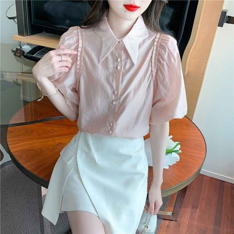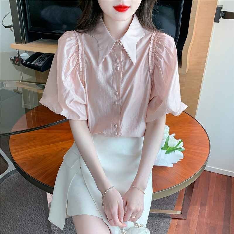 半袖シャツ ブラウス ボリューム袖 シャーリング きれいめ 清楚 レトロ S ピンク