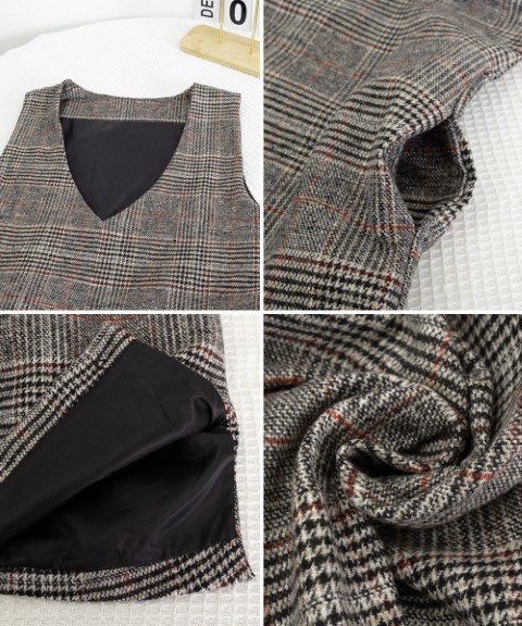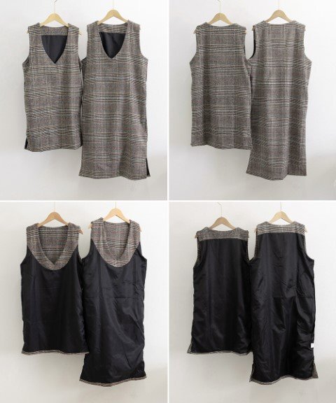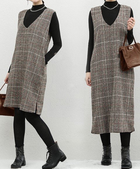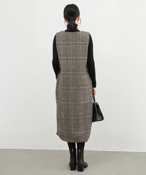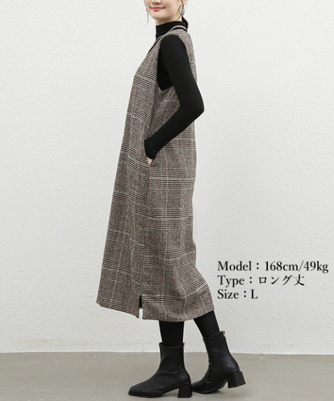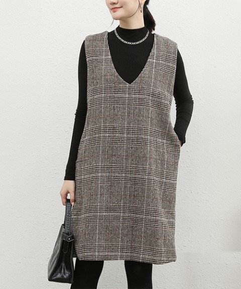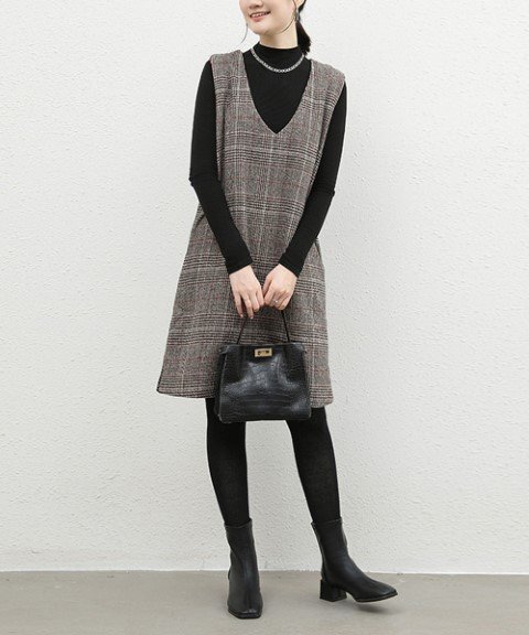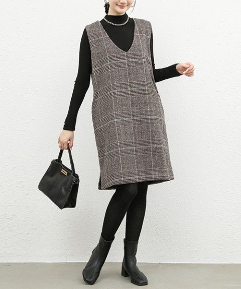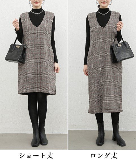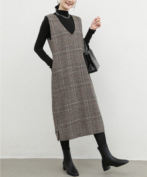 Vネックでゆったりとしたシルエットが魅力のストレートチェック柄ジャンパースカートです。