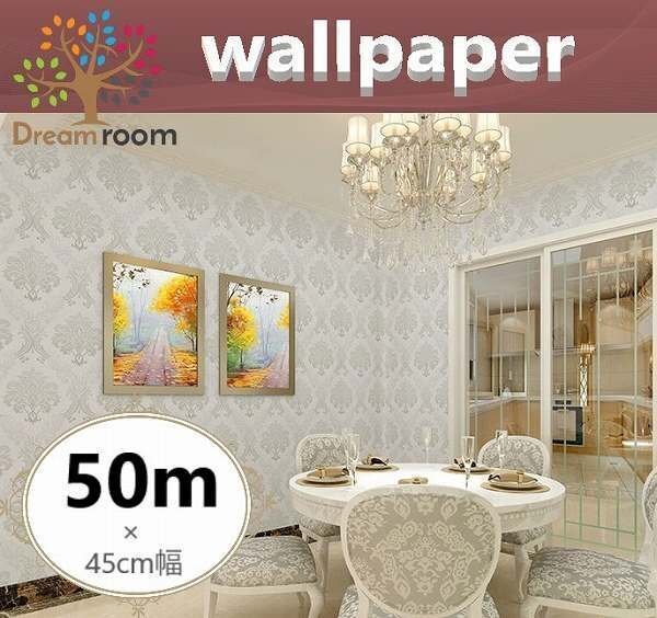 【 50m 】 ダマスク柄 白×シルバー 壁紙 45cm幅 アンティーク ウォールペーパー北欧風 インテリア リビング はがせる シール DIY 糊付き