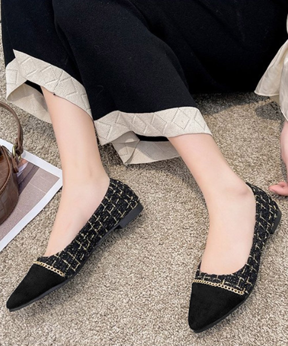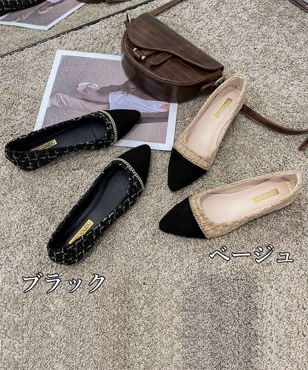 スエード生地とツイード風生地に合金チェーン、上品でお洒落な異素材mixパンプス
