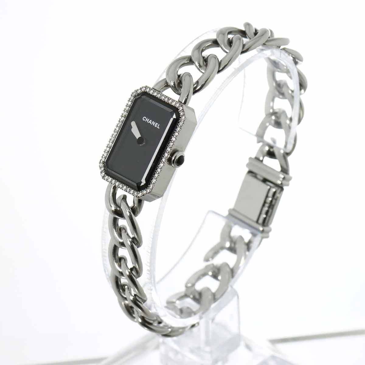| 商品概要 | シャネルから2013年バーゼルフェアー発表以来、人気の『プルミエール』。SS素材に56個ダイヤモンドが施され、リューズにはオニキス入りのお洒落な8角形ケース。ブレスレットサイズ調節は留め具に連結している取り外し可能なリンクを調節して変更することができるお勧めの逸品。 |