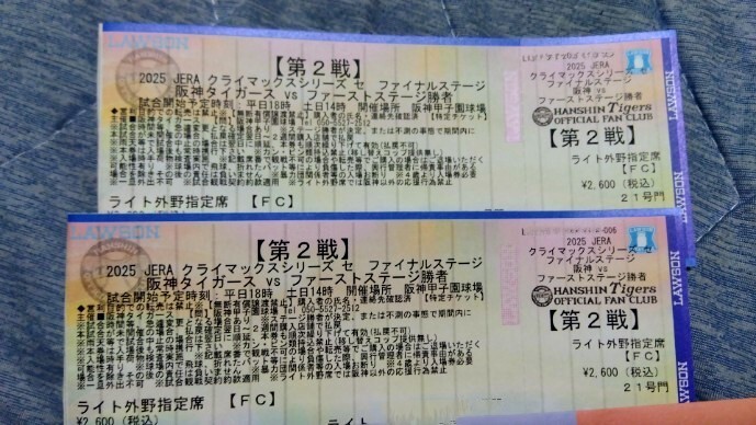 【クライマックスシリーズ第2戦 甲子園】 ライト上段 2連番