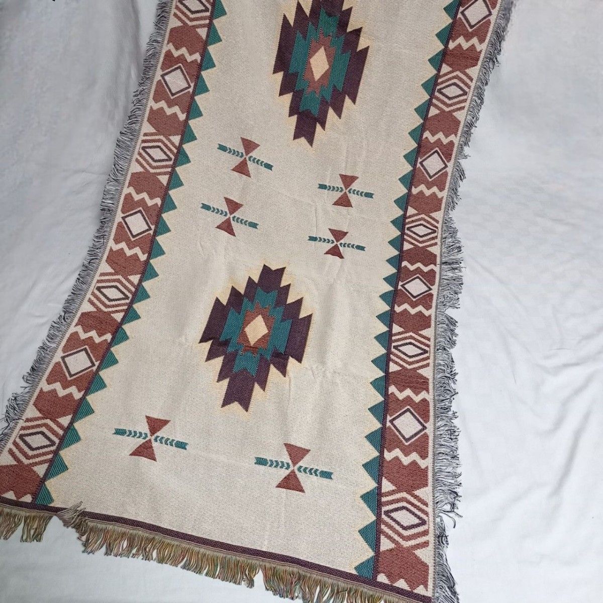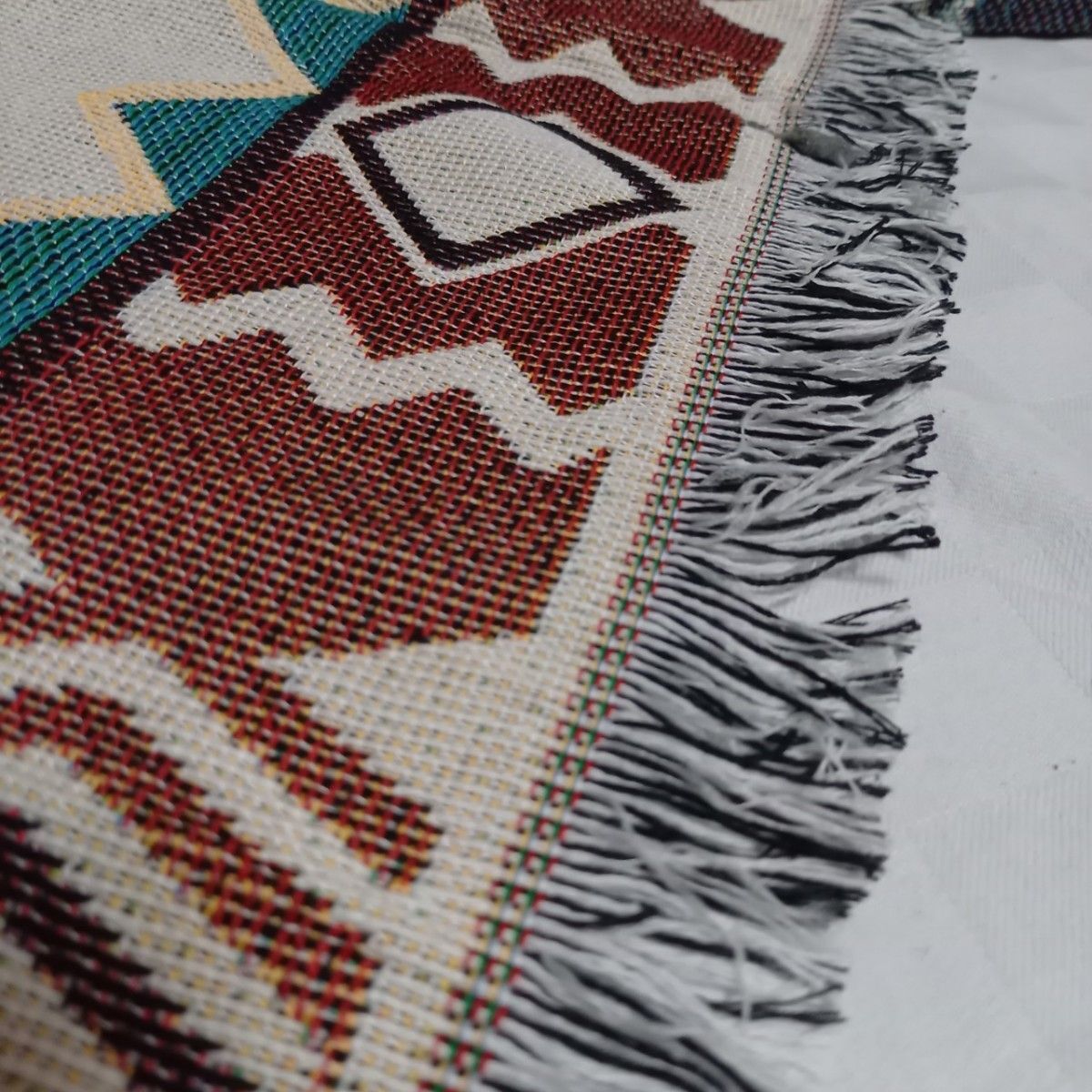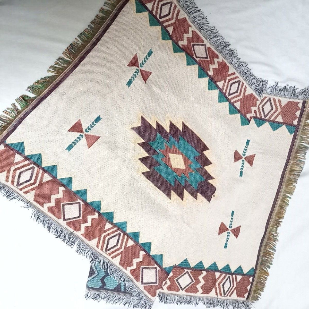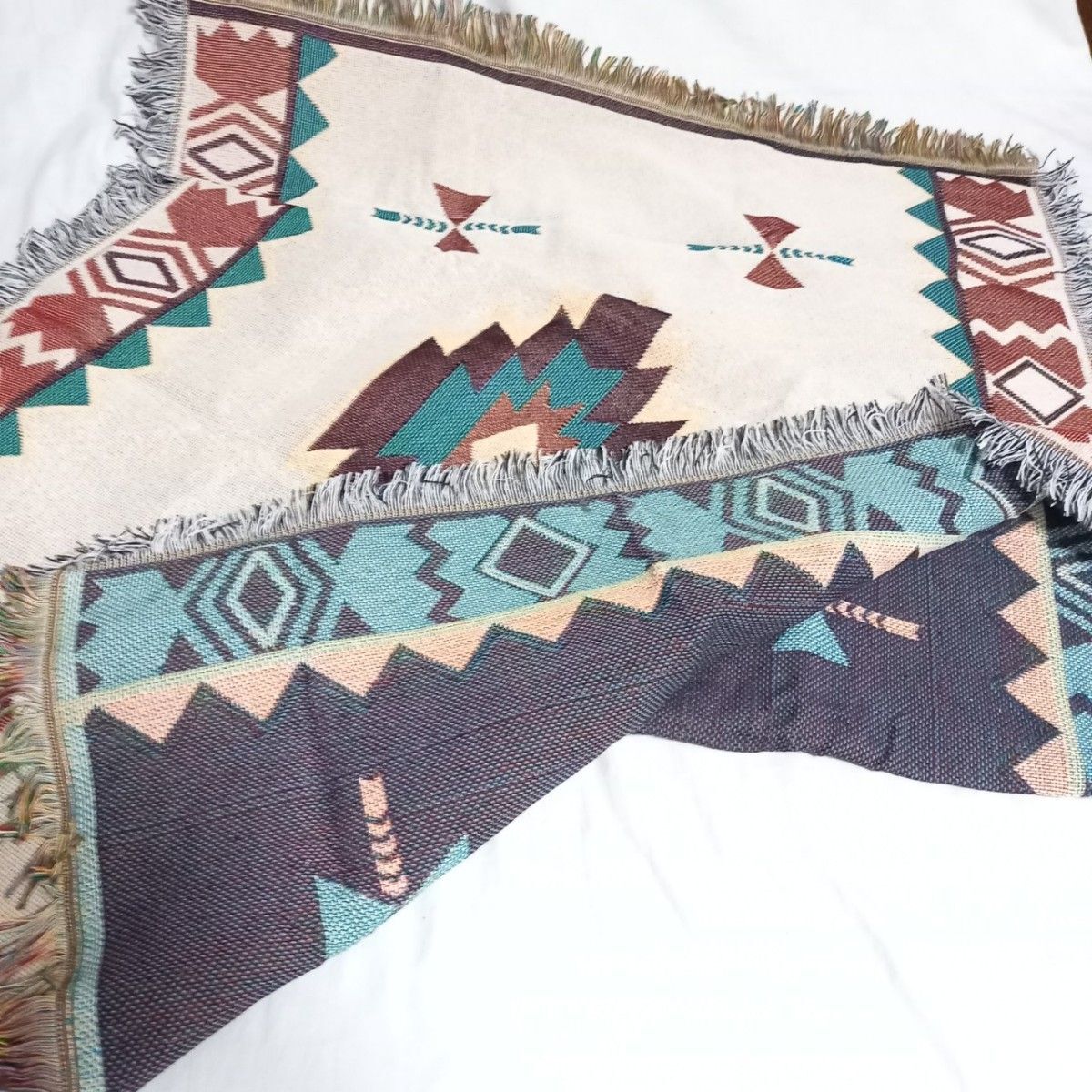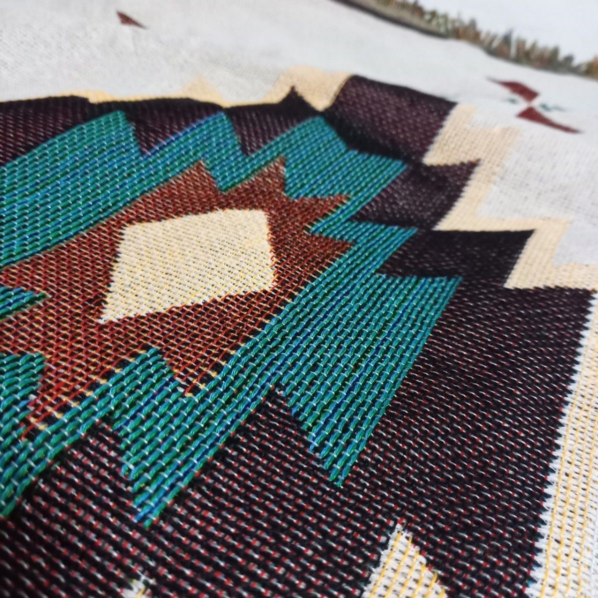 ターコイズ×ブラウンの配色が印象的なオルテガ柄ブランケット。
