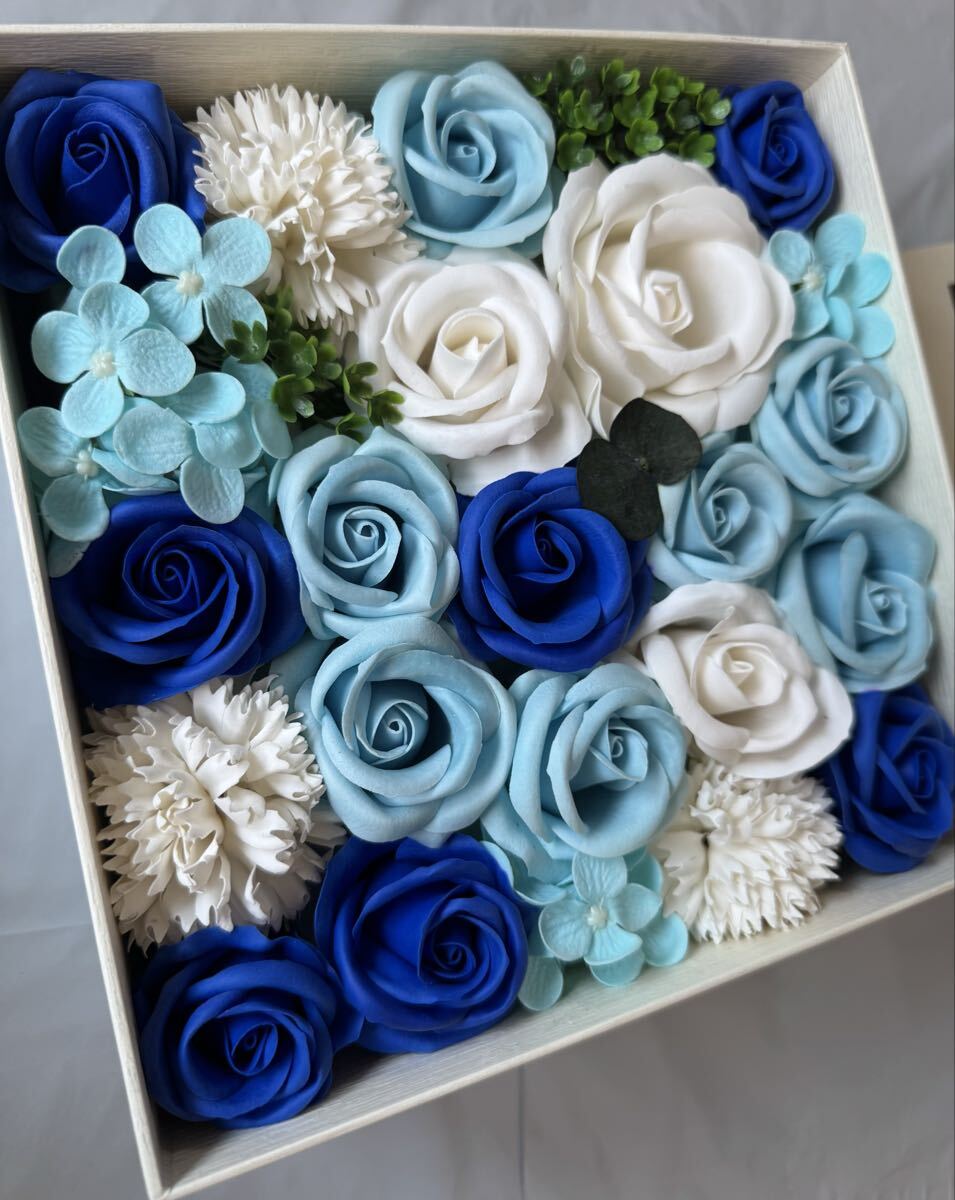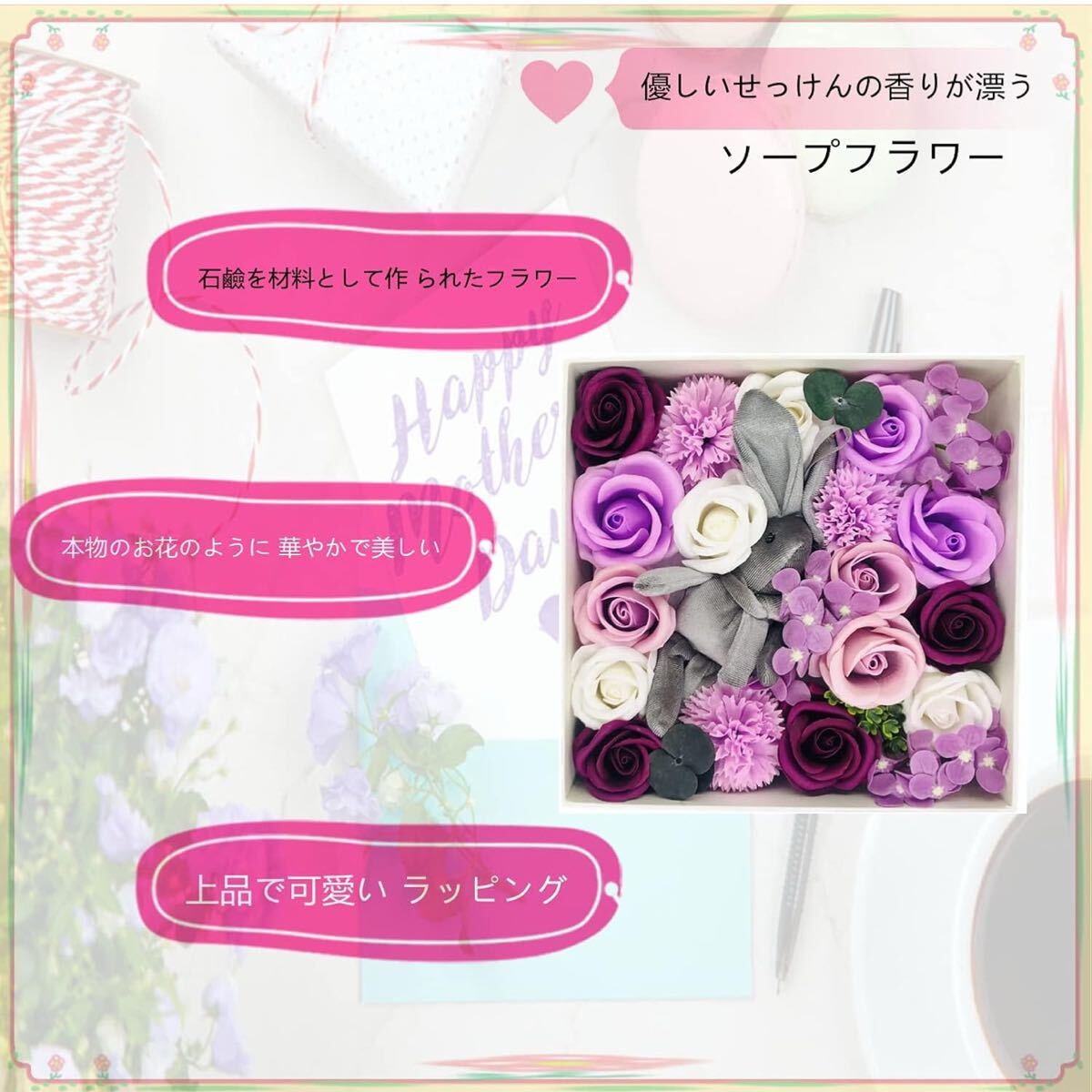 ソープフラワーは花びら一枚一枚が香りのよい石鹸からつくられた、ほのかに香る観賞用のお花です。生花と違い水やりの必要がなく、枯れることもございませんので、色鮮やかな見た目とかすかな香りを長くお楽しみいただけます。特別なお手入れも不要で、アレルギーの原因となる花粉等もございませんので、場所を選ばず好きなところに飾ることが可能です。プリザーブドフラワーよりもお求めやすく、贈答用・自宅用に大変人気の商品です。一つ一つ手作りのため花の配置等が写真と異なる場合がございますので、ご了承ください。