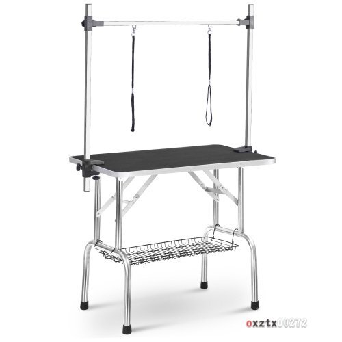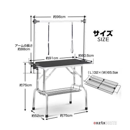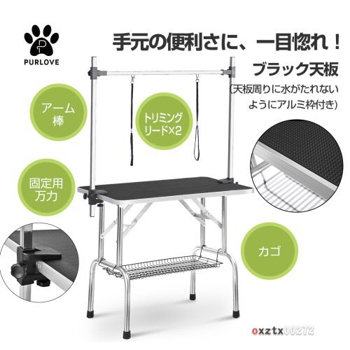 素材 アーム:ステンレス鋼 かご、足元:スチール 天板:ゴム(周りにアルミ枠) 万力:ナイロン カラー ブラック 梱包個数 1 梱包サイズ 92*62*12cm 重量(Net weight) 15.5kg 重量(Gross weight) 17.0kg 耐荷重 100kg 生産国 中国 組立品/完成品 組立品 便利さにかけては負けません 家庭用に使い、お手頃価格のトリミングテーブルを作りました。 お家でブラッシングやシャンプー後のドライイングが楽にできるようになりますよ! 折り畳みトリミングテーブル・ペットとの親密度アップ 家庭において違和感が無いように! 1、頑丈なH型アーム棒 2、アームの高さが無段階調整 3、汚れが取り易く、滑り難い天板 4、折畳式でコンパクトに 5、水は床に垂れないアルミ枠 ※このテーブルは家庭用です。業務使用には使わないでください。 手元の便利さに、一目惚れ! ブラック天板(天板周りに水がたれないようにアルミ枠付き) 固定用万力 アーム棒 カゴ トリミングリード*2 トリミングテーブル 材質 アーム:ステンレス鋼 かご、足元:スチール 天板:ゴム(周りにアルミ枠) 万力:ナイロン 梱包サイズ 92*62*12cm(17kg) お手入れ 1.柔らかい布でこまめにお手入れしてください。 2.掃除機や専用のブラシをご使用いただき、お手入れしてください。 3.さびが付かないように、普段はかご、アーム棒を干してから設置してください。 n おすすめポイント ◆ アームの高さが無段階調整 高さ88cmのアームは自由に高さを調整できるので、ペットの大きさに合せて柔軟に変えることができます。 ゴールキーパースタイルのアームがあり、垂直方向と水平方向に簡単に調整して、わんちゃんに最適な位置を調整できます。 さらに、万力で固定するタイプなのでテーブルのどの位置にもアームの取り付けが可能。 ◆ 完璧な安定性と耐久性 ステンレス鋼製のアームと天板周りのアルミ枠を使用して、耐久性が優れています。頑丈なH型アームは、安定性も高いです。 ◆ 腰を痛めにくい丁度良い高さ 作業台までの高さは75cmとなっており、屈まなくて良い丁度良いサイズ。 トリミング中の足腰への負担を軽減できます。 ◆ 汚れが取り易いし、静電気を防止し、滑り難い天板。 カット時にハサミの先が引っかからないよう天板を採用しました。さらに滑りにくい材質を採用なので、安全にトリミングできます。 ◆ 折畳式でコンパクトに 折りたたみ式で使わない時は畳んでコンパクトに収納することができます。 ◆ テーブルの足元にはカゴを設置 テーブル下にはトリミング用品を置いておける便利なカゴ付き。トリミング用品を置いておけるので便利です。 ◆ 細部までのこだわり 耐荷重は約100kgと充分な強度で猫、小型犬、中型犬が使える大きさ。 万力で固定するタイプなのでテーブルのどの位置にもアームの取り付けが可能。 ワンちゃんを乾燥中テーブルから床に水がたれないようにアルミ枠付きです。 リード紐の取り付け箇所は3箇所あり、簡単に付け替えられます。 n お手入れ 1.柔らかい布でこまめにお手入れしてください。 2.掃除機や専用のブラシをご使用いただき、お手入れしてください。 3.さびが付かないように、普段はかご、アーム棒を干してから設置してください。 n 備考 ※写真にある道具は含めてありません。 ※ご使用中は愛犬から目を離さないでください。 ※開封時は新品特有のにおいがある場合がございます。 ※脚が折曲がらないようロックを兼ねますので、テーブルご使用時には必ずカゴを設置してください。 ※曲線部や個体差がありますので、表記と多少の差異が生じることがあります。予めご了承ください。 ※商品のデザインが写真と多少違う場合がございますが品質上問題なく使えますのでご了承下さい。 ※仕様やデザインは改良のため予告なく変更することがあります。