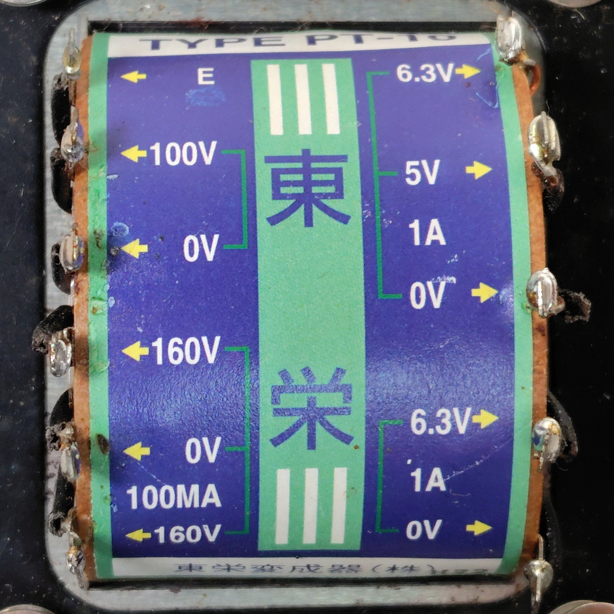 参考(現行モデル・出品物はハムプルーフベルトなし):真空管用 160V-0-160V 100mA/5V-6.3V 1A/6.3V 1A [PT-10N] - 秋葉原のトランス専門店 東栄変成器