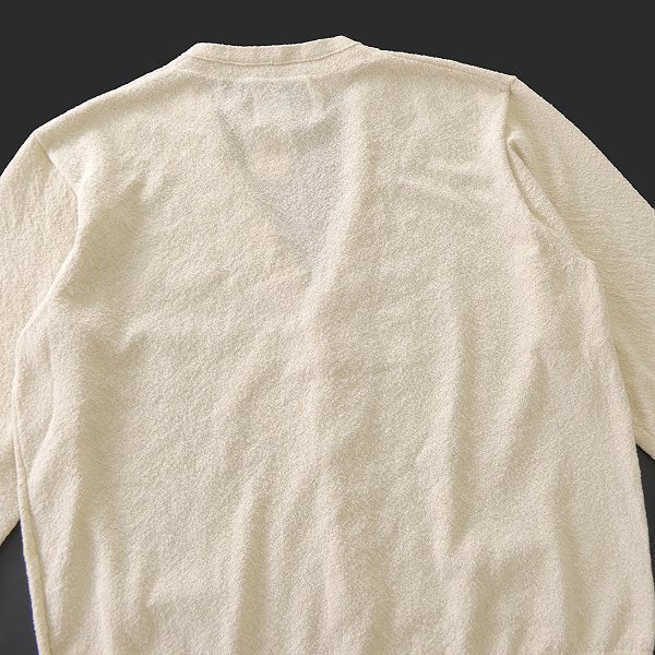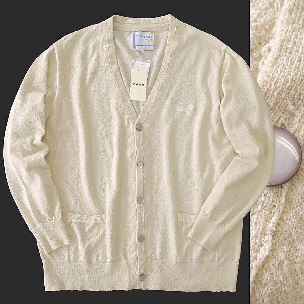 TOWNCRAFTに別注したニットカーディガン。 リラックス感のあるシルエットはトレンド感があり、Tシャツの上に羽織るだけでサマになります。 ベーシックなVネックデザインで着回しやすく、インナー次第で幅広いスタイリングを楽しめます。 胸元には同色のステッチロゴ刺繍を施し、上品な艶を持つボタンが全体を引き締めています。 素材にはループヤーンを採用し、細やかなハイゲージ編みで仕上げました。 厚すぎない程よい生地感とドライな質感で、快適な着心地と上品な風合いを兼ね備えています。 |