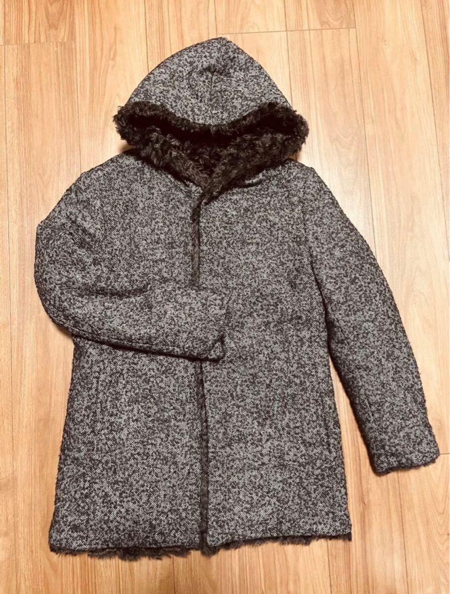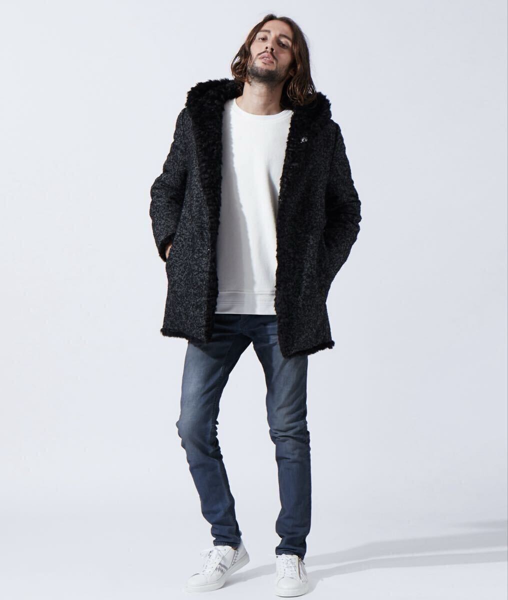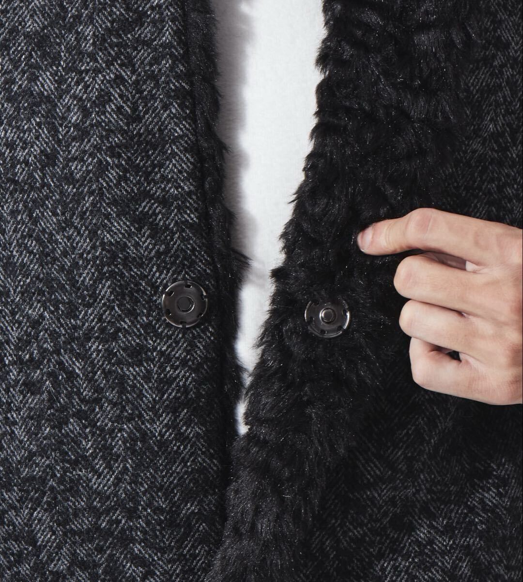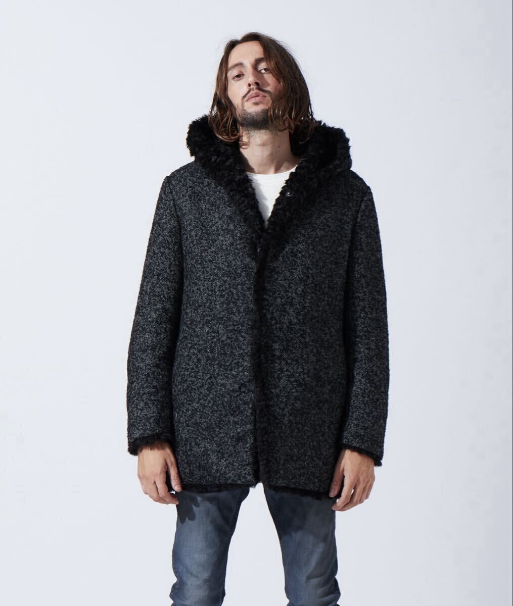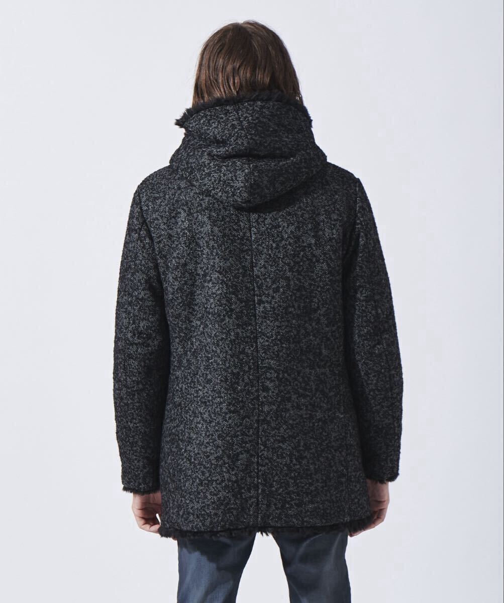 ウールツイードとエコファーを使用し、リバーシブルに仕立てています。
