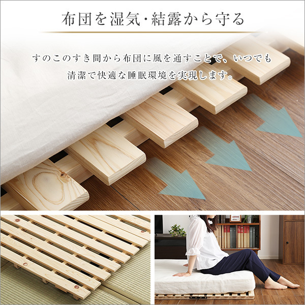 【ポイント】 通気性バツグンのすのこベッドです。 材質はすのこベッドにおける最良の檜材を使用しました。 頑丈な耐荷重180kgです。 布団も干せる2つ折りタイプです。 |