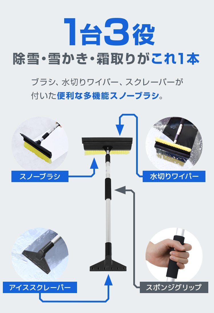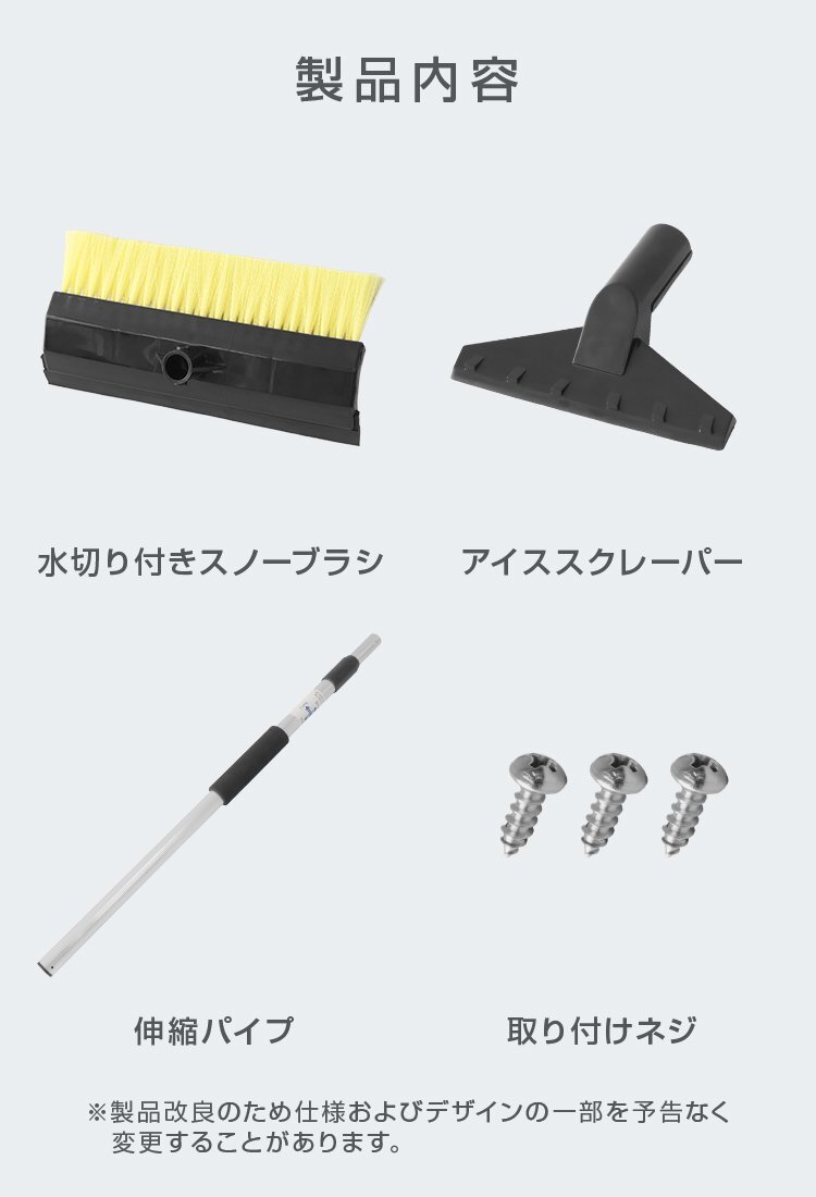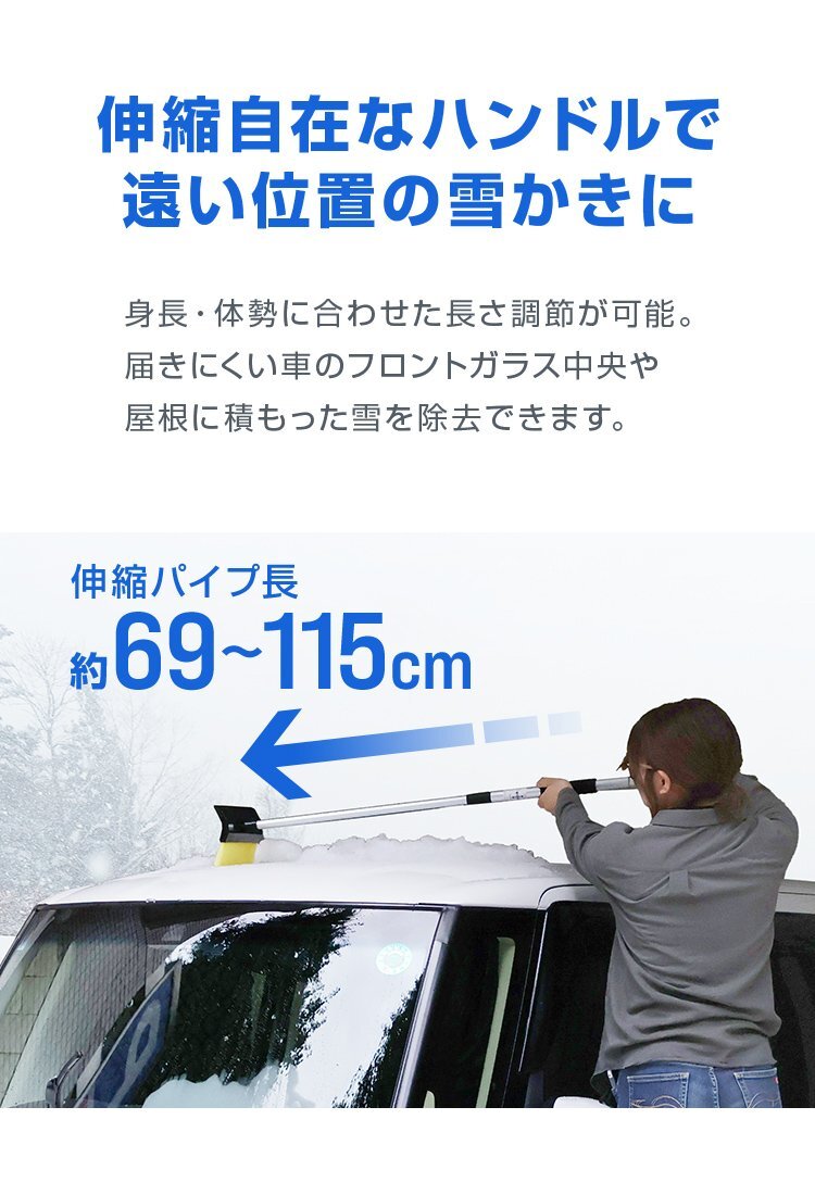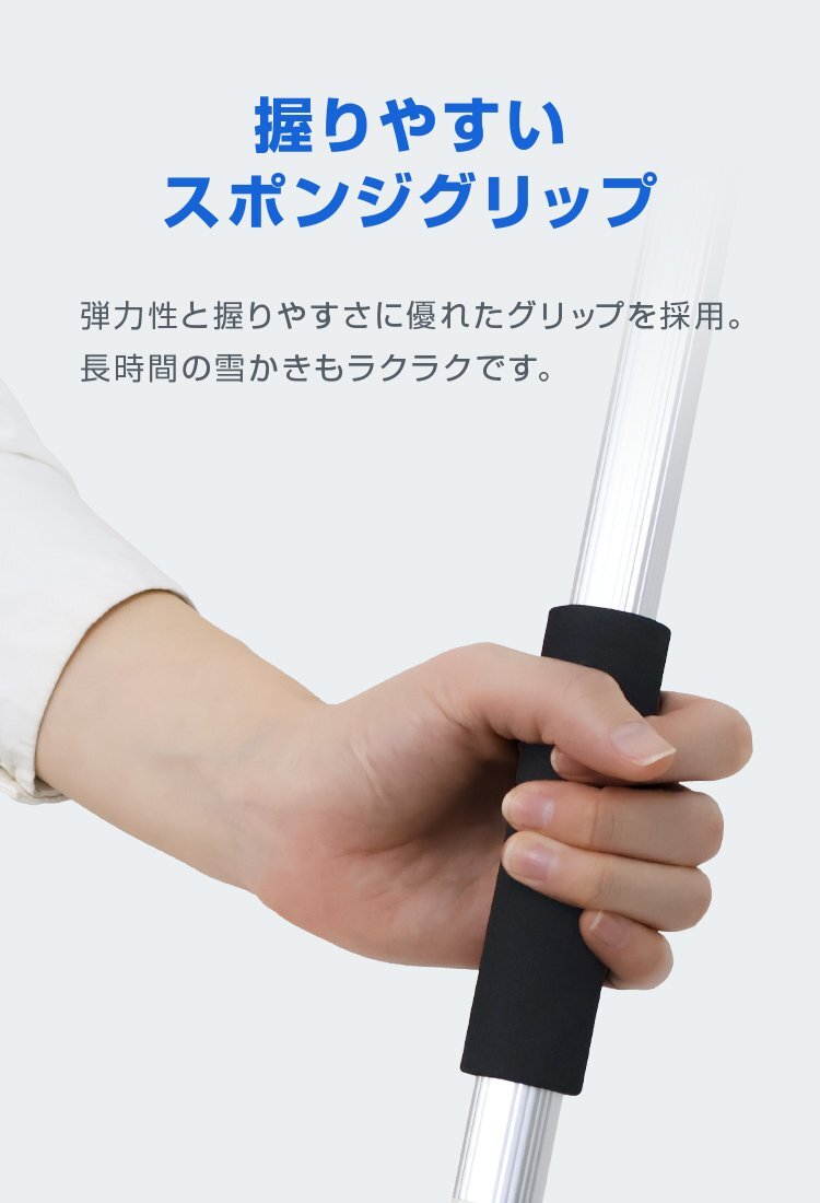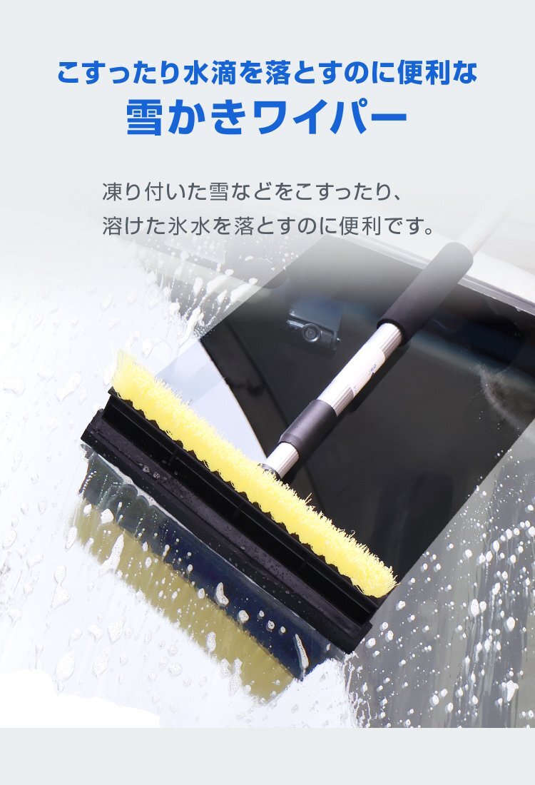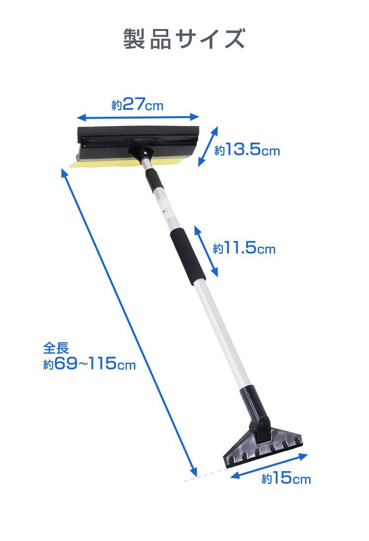 水切りワイパー付き! 握りやすく、手に心地よいスポンジグリップです。 ブラシ部は窓ガラスについた雪を払うのに便利 、 ゴムワイパーは凍りついた雪などをこすったり解けた氷水を流します。 また、スクレイパーはタイヤ周辺や足回りの固く凍りついた雪や氷を砕きます。 伸縮式なので、車や用途に合わせて長さを調節できます。(約69cm~最大115cm) 【仕様】 サイズ(約):270×135×690~1150mm 重量(約):360g 材質:アルミニウム、PVC、ABS樹脂他 |