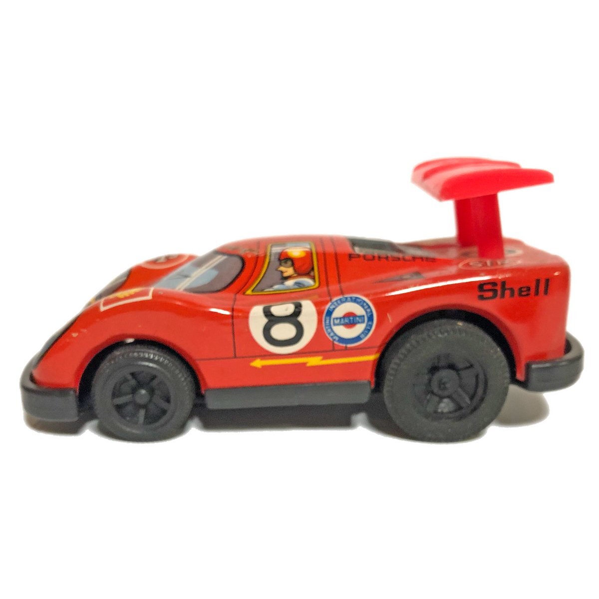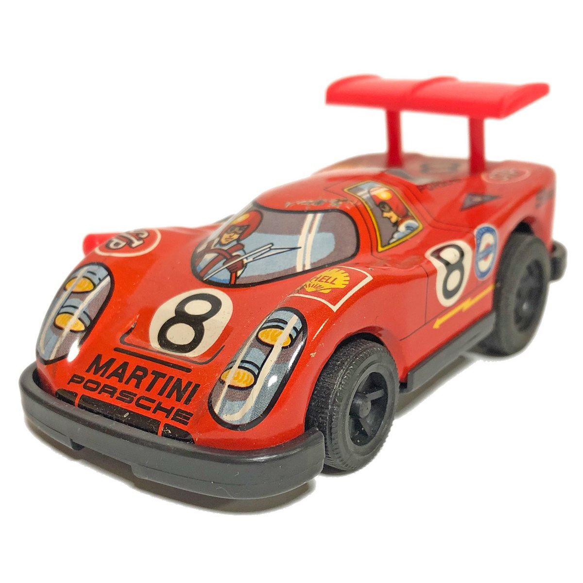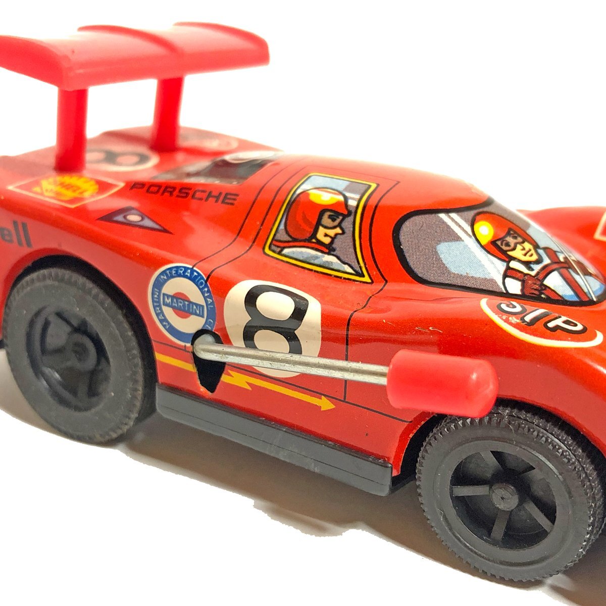 三幸製作所 Lever Action Porsche Racing 917 Type レバーアクション レーシングポルシェ917 Tin Toy Porsche917 赤です。 フリクション駆動のワイドトレッド、ワイドタイヤを履いたプラスチックシャーシにレーシングプリントを施した917タイプのブリキポルシェ。 当時のモータースポーツ史に於いて圧倒的な強さを誇った伝説ポルシェ917。 その中でもルマンでの優勝等、一番強かったころのポルシェマルティーニレーシングチーム、ショートテールの917Kです。 基本ベースの白をはじめ黄色、珍しいストライプのないマルティーニの赤。それぞれ色違いで同一デザインではなく、専用プリントされているシリーズの中の赤になります。 Shell文字抜のスポンサーステッカーもレトロで デフォルメされてもなお美しいポルシェのシルエットをうまく成型しています。 3台並べれば(出品は赤のみとなります、3台セットではありませんのでお間違無きようお願いいたします)立派なポルシェパドックの出来上がりです。 ボディーはブリキ。 シャーシ タイヤはウイングはプラスチック製です。 動力源は、一般的なゼンマイ(Wind Up)タイプとなりますが、このタイプは大変珍しいワンアクションのレバーアクションタイプです。 通常 幾数回になるゼンマイの巻き上げ工程をレバーに減速巻き上げと言う大変高い技術力(レバー近辺に圧力が集中するための強度アップ等)で克服し 小さいボディーに本物さながらの高出力動力で一回で20メートル弱猛ダッシュします。 そのためフロントはプラスチックタイヤですがリヤの駆動輪はスリップ防止のゴムタイヤとなります。 レバーフリクション駆動、本体のみ箱は有りません。Made in Japan 長い歴史を誇る葛飾 三幸製作所製です。 |