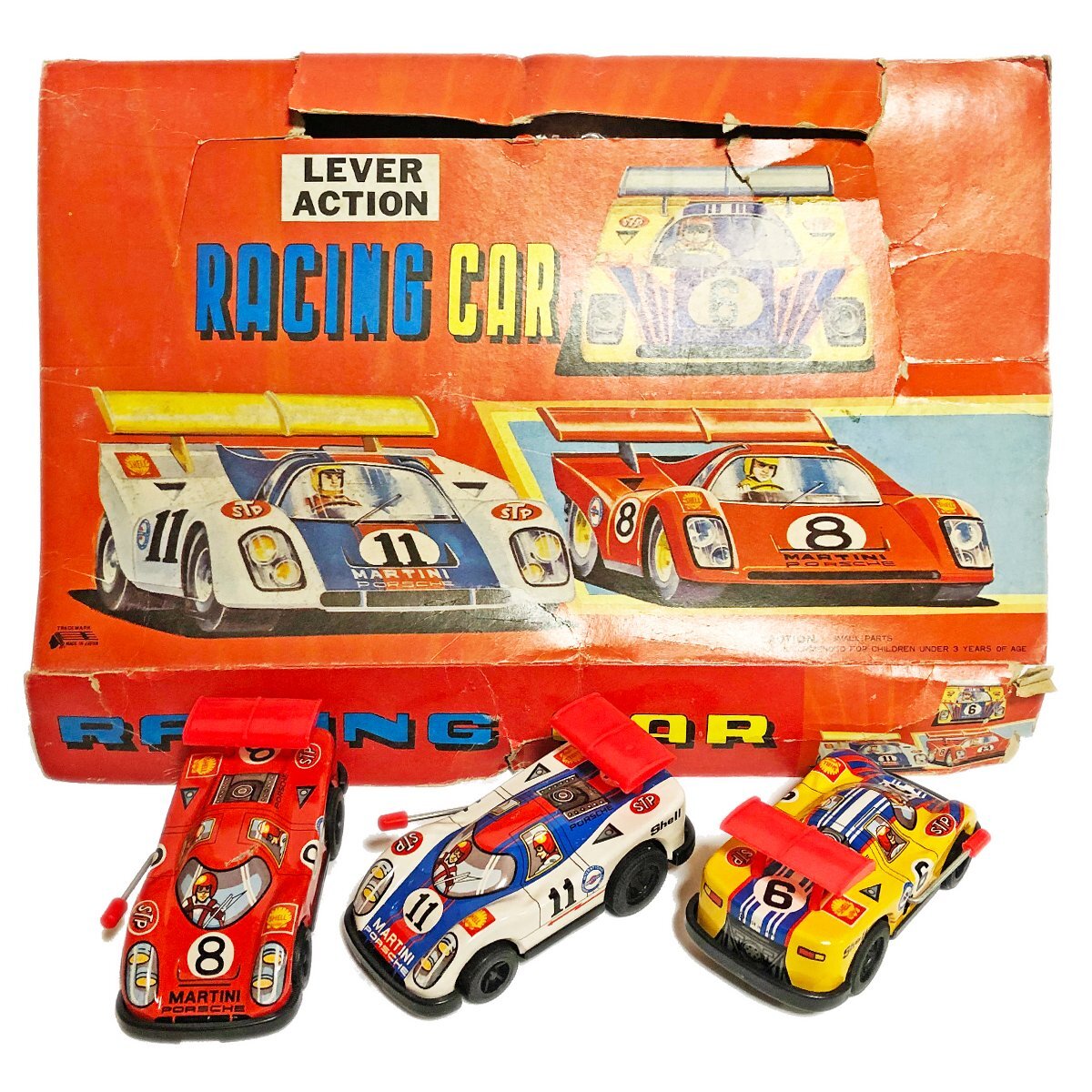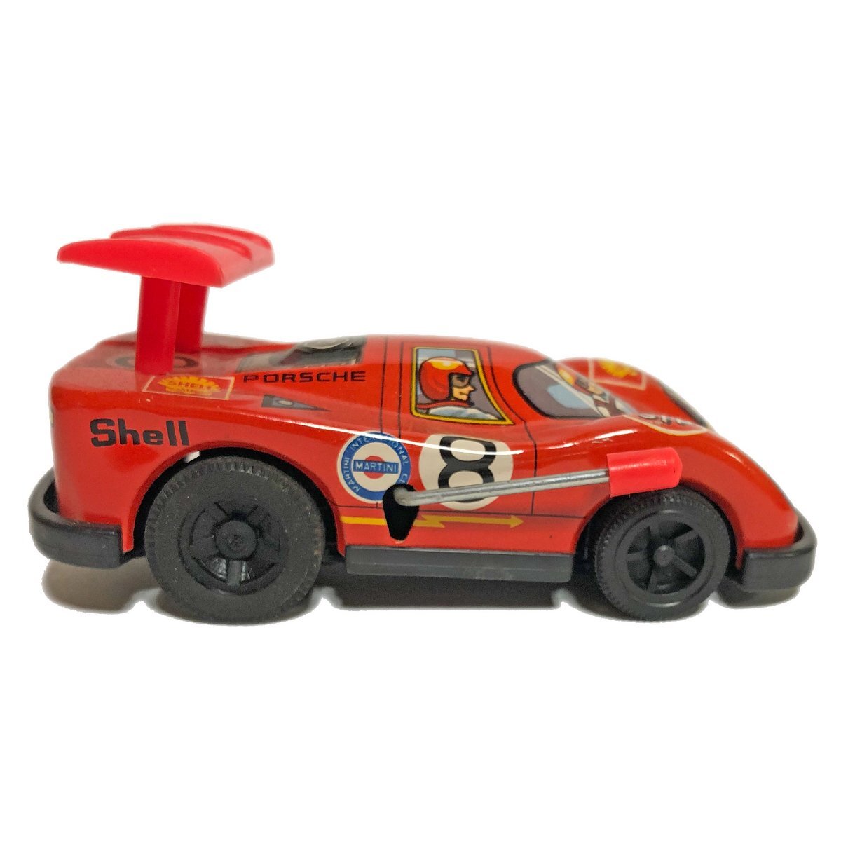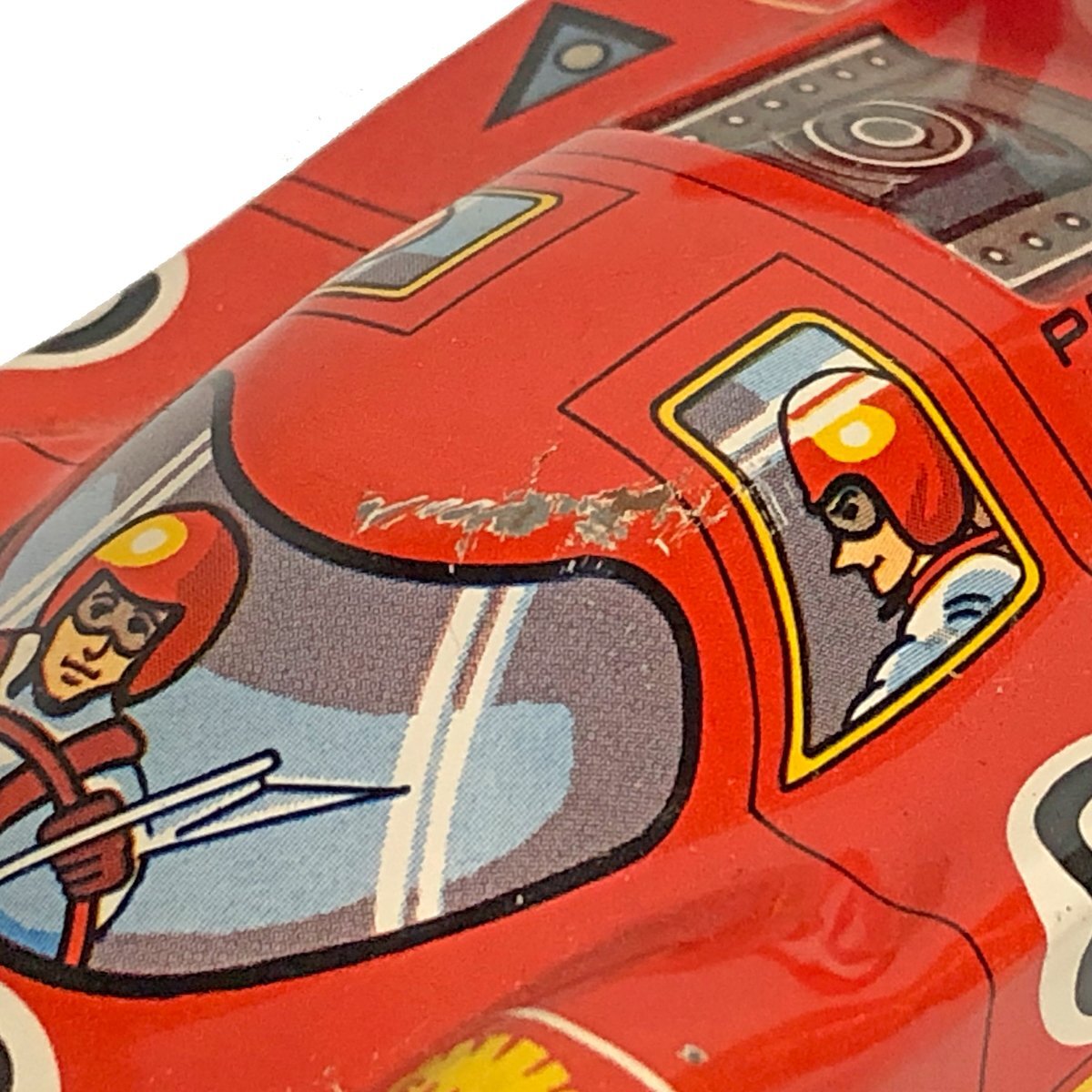 三幸製作所 Lever Action Porsche Racing 917 Type レバーアクション レーシングポルシェ917 Tin Toy Porsche917 赤です。 フリクション駆動のワイドトレッド、ワイドタイヤを履いたプラスチックシャーシにレーシングプリントを施した917タイプのブリキポルシェ。 当時のモータースポーツ史に於いて圧倒的な強さを誇った伝説ポルシェ917。 その中でもルマンでの優勝等、一番強かったころのポルシェマルティーニレーシングチーム、ショートテールの917Kです。 基本ベースの白をはじめ黄色、珍しいストライプのないマルティーニの赤。それぞれ色違いで同一デザインではなく、専用プリントされているシリーズの中の赤になります。 Shell文字抜のスポンサーステッカーもレトロで デフォルメされてもなお美しいポルシェのシルエットをうまく成型しています。 3台並べれば(出品は赤のみとなります、3台セットではありませんのでお間違無きようお願いいたします)立派なポルシェパドックの出来上がりです。 ボディーはブリキ。 シャーシ タイヤはウイングはプラスチック製です。 動力源は、一般的なゼンマイ(Wind Up)タイプとなりますが、このタイプは大変珍しいワンアクションのレバーアクションタイプです。 通常 幾数回になるゼンマイの巻き上げ工程をレバーに減速巻き上げと言う大変高い技術力(レバー近辺に圧力が集中するための強度アップ等)で克服し 小さいボディーに本物さながらの高出力動力で一回で20メートル弱猛ダッシュします。 そのためフロントはプラスチックタイヤですがリヤの駆動輪はスリップ防止のゴムタイヤとなります。 レバーフリクション駆動、本体のみ箱は有りません。Made in Japan 長い歴史を誇る葛飾 三幸製作所製です。 |