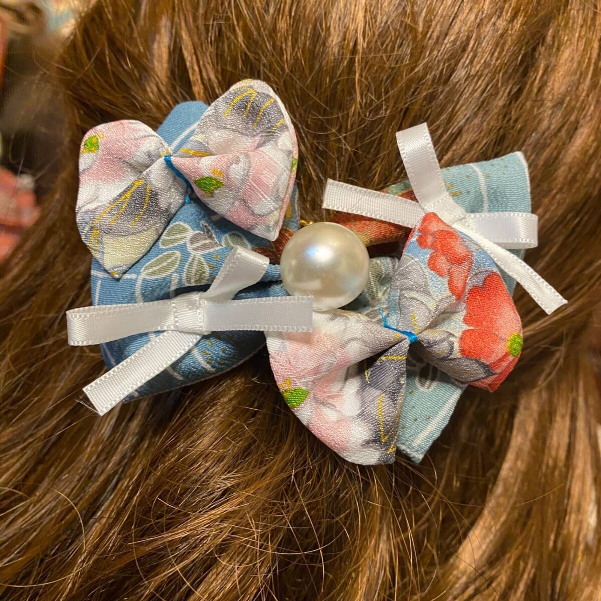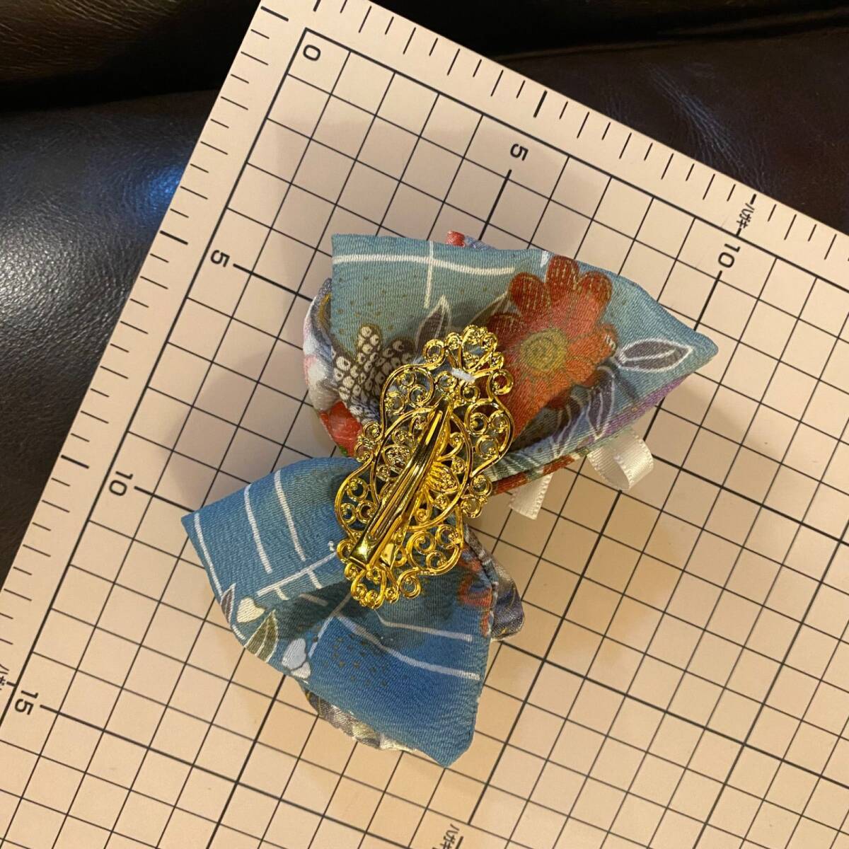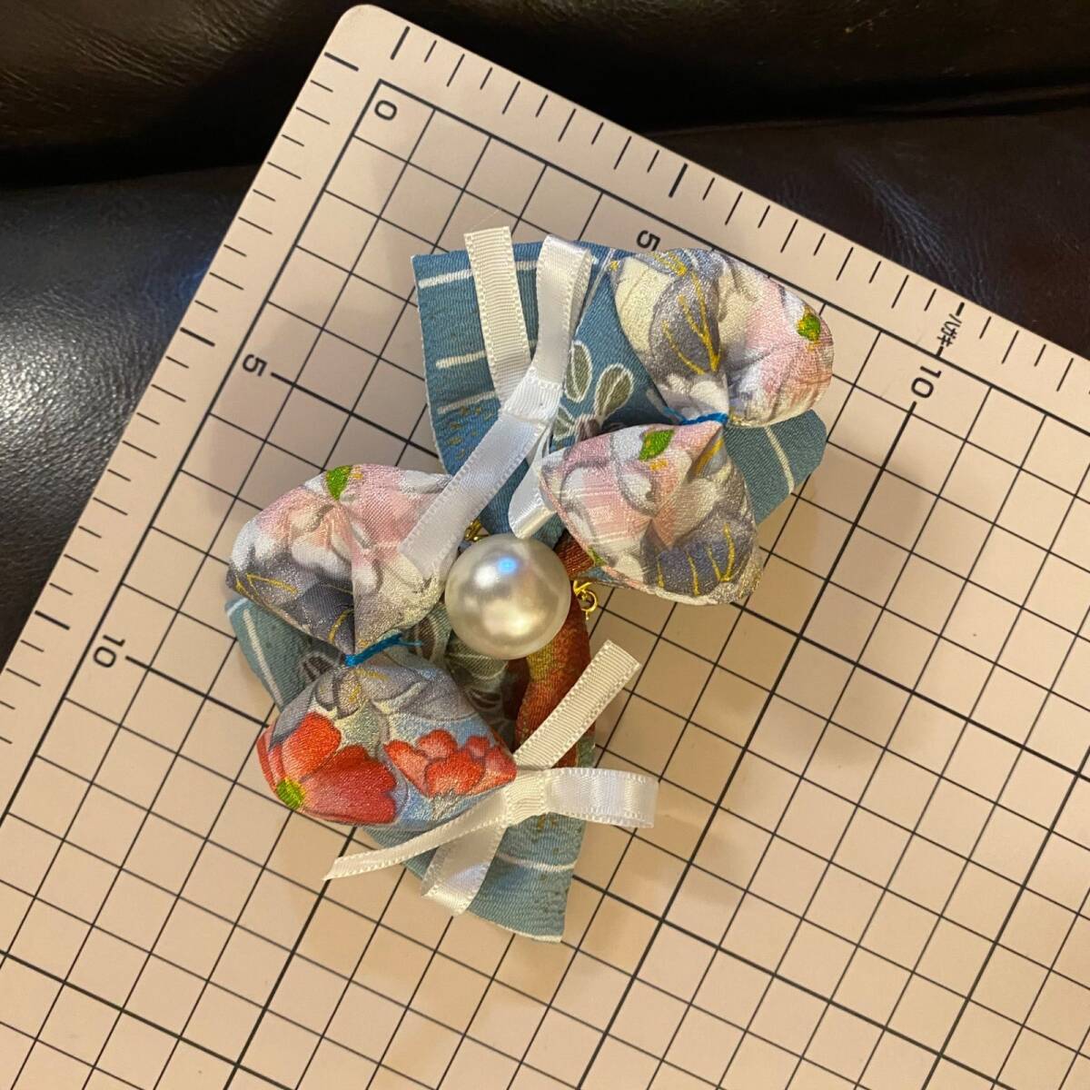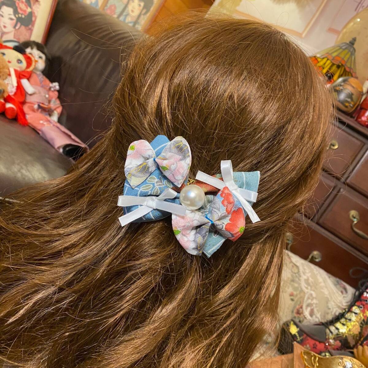 「水色夢綴り」は、淡い水色を基調にした着物地から生まれた、繊細なリボンヘアクリップです。