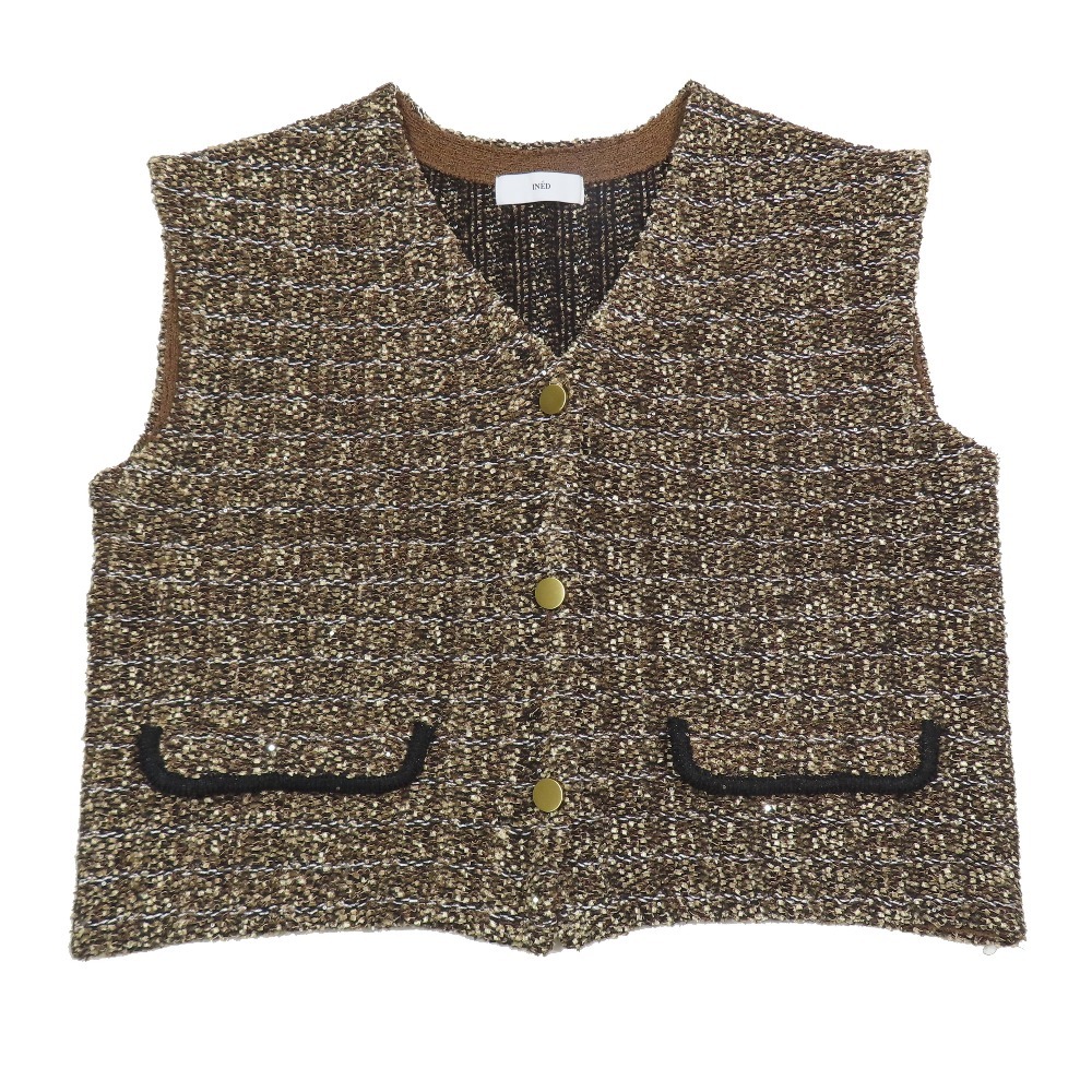 商品名:INED イネド ツイード風ジレ ベスト ショート丈 Vネック 金ボタン フェイクポケット カットソー 9 ブラウン