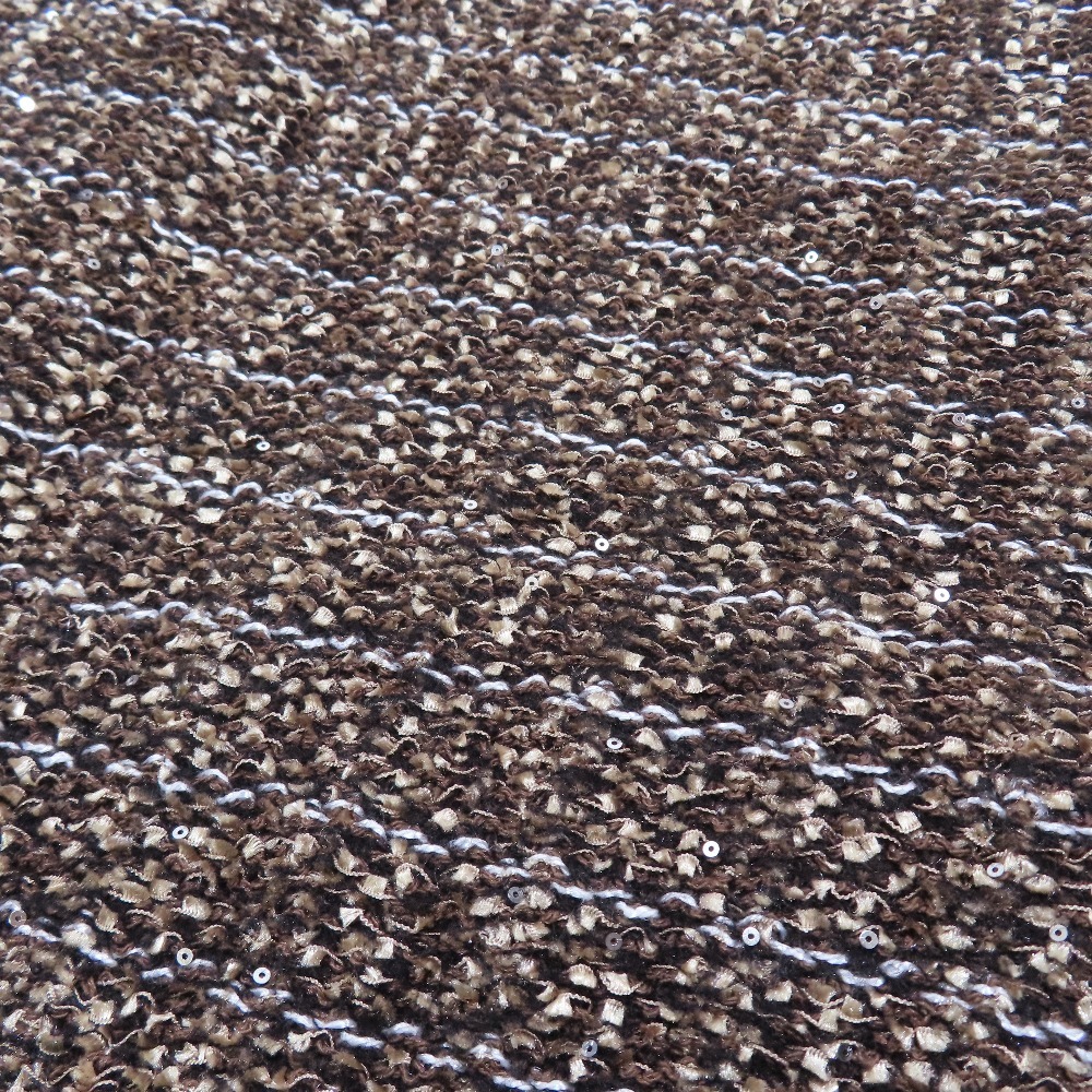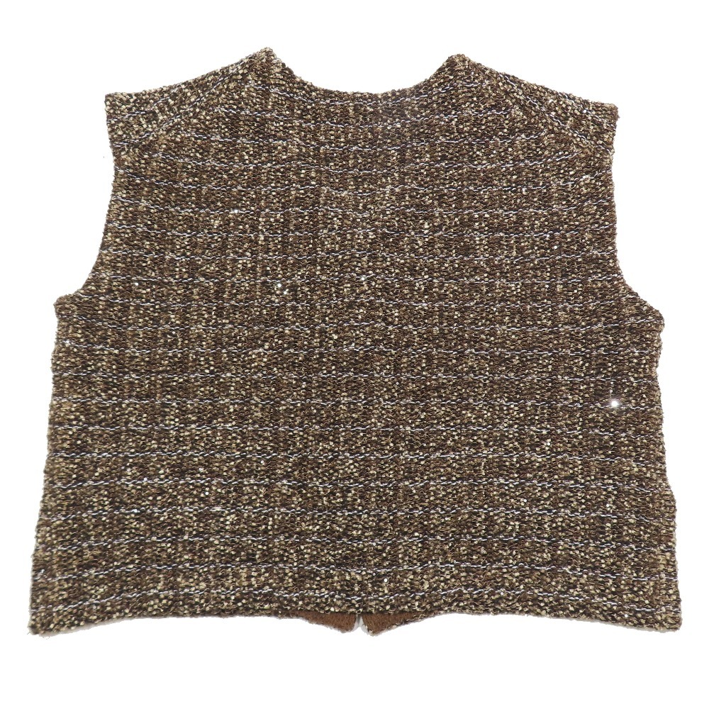 キラキラと光るスパンコールと様々な糸を使い編み立てられた柄が上品で華やかな印象のツイード風ニットジレ