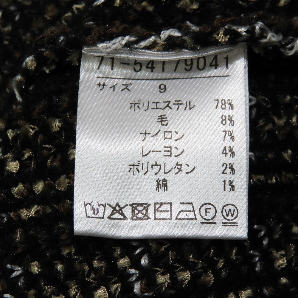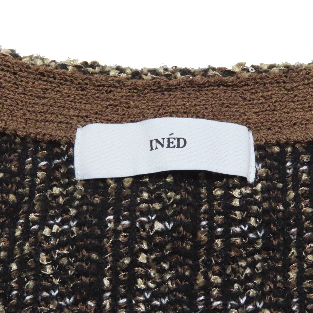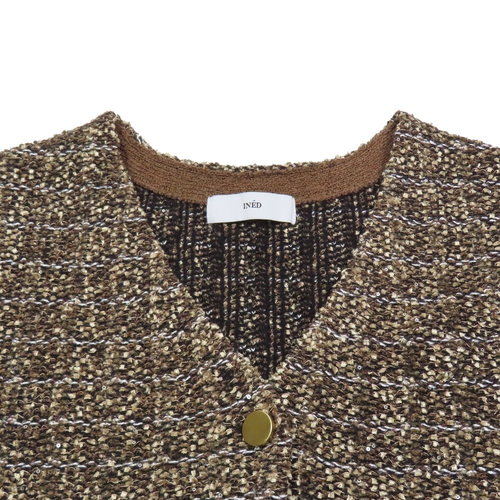 新品同様 INED イネド ツイード風ジレ ベスト ショート丈 Vネック 金ボタン フェイクポケット カットソー 9 ブラウン