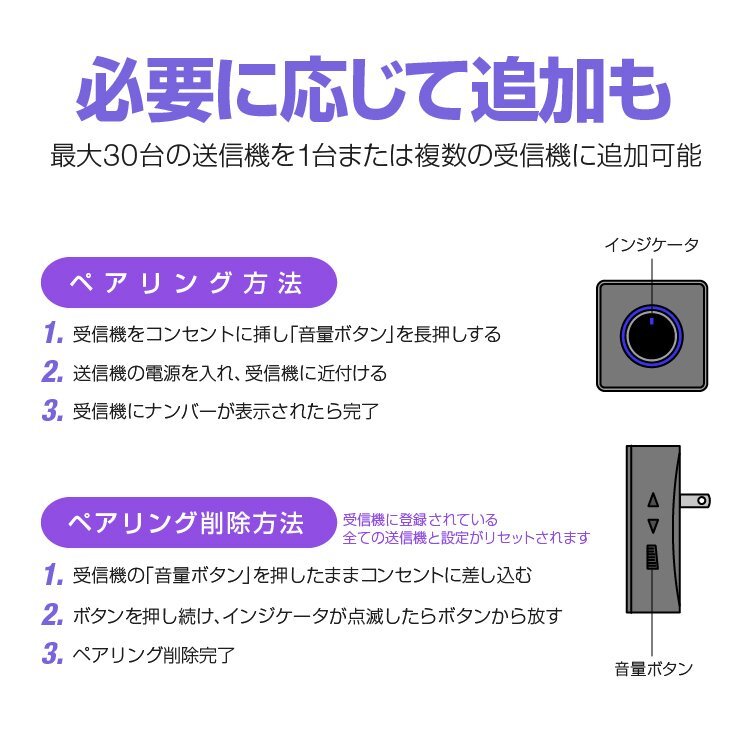 1.受信機をコンセントに挿し、音量ボタンを長押しする(インジケータ点滅)