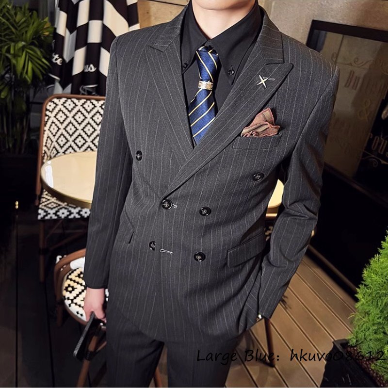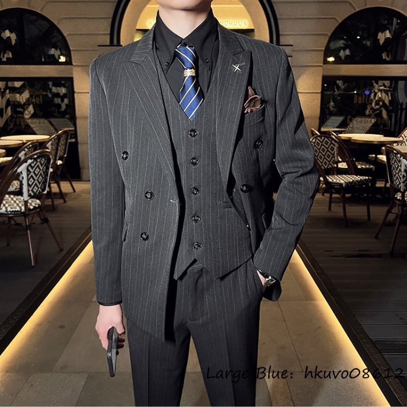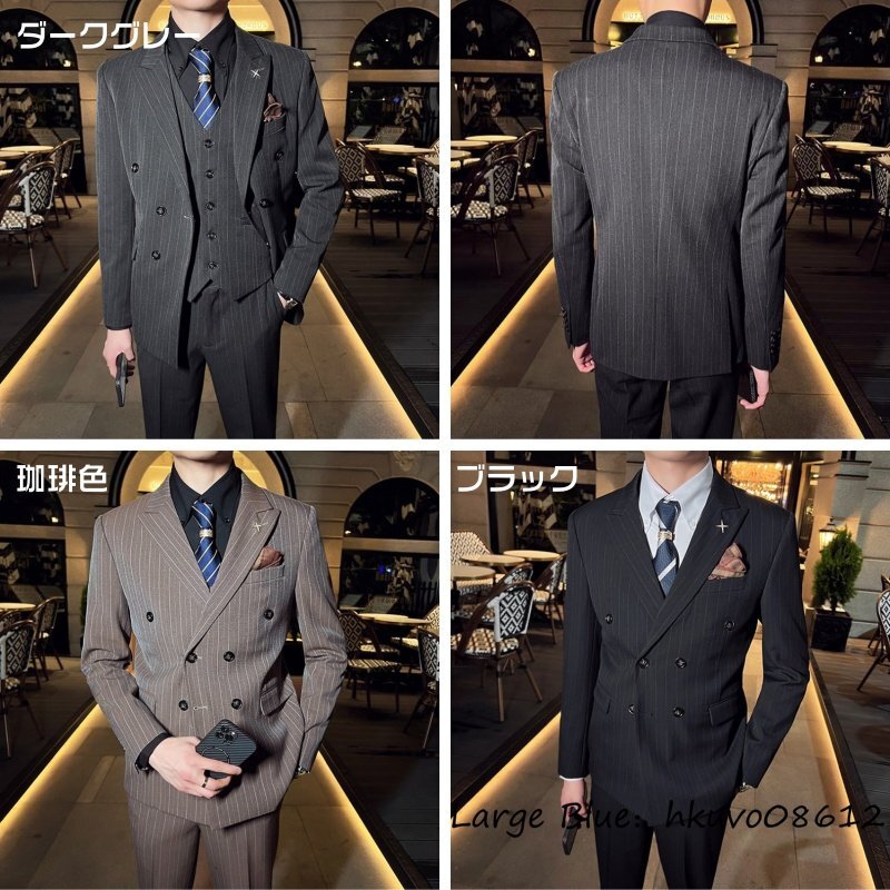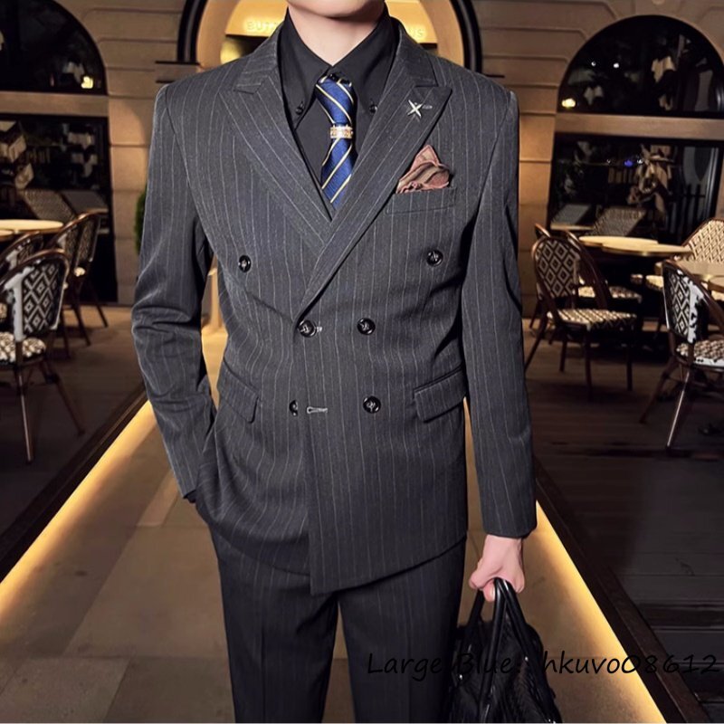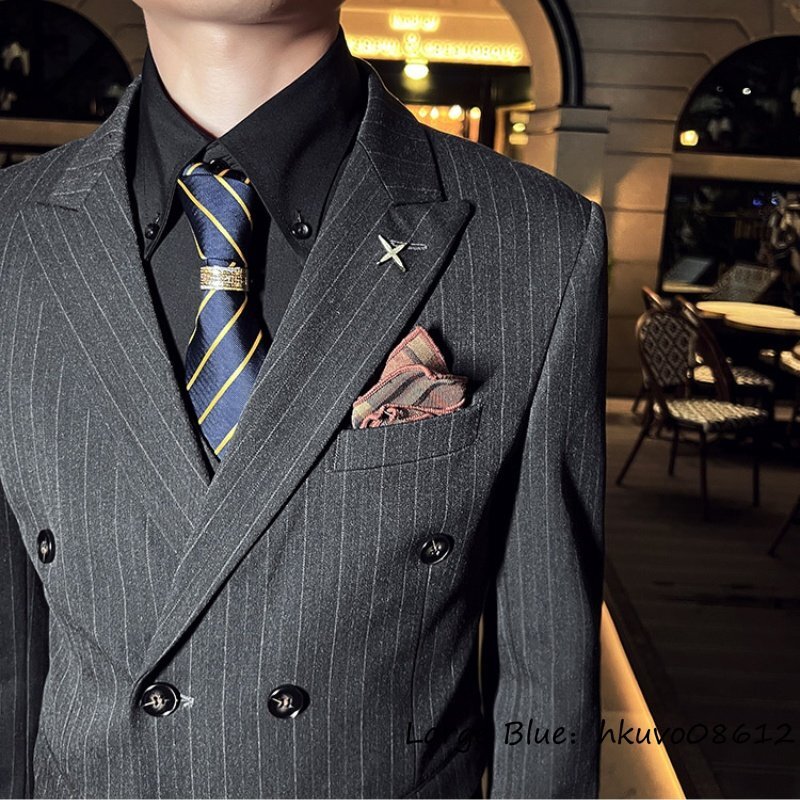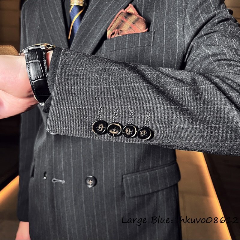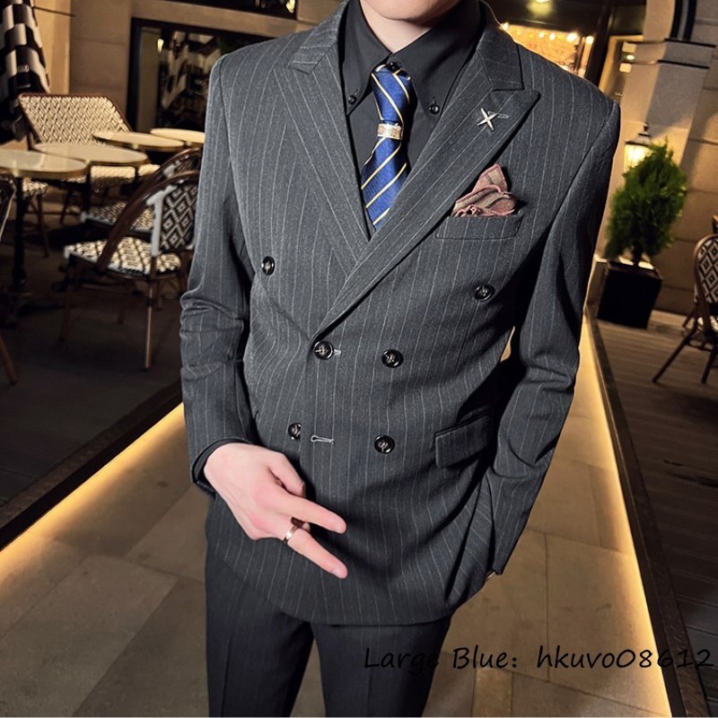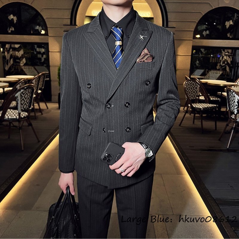 定価5万★新品 スリーピース メンズ ストライプ柄 ダブルスーツ スーツセット スタイリッシュ 背広 二つボタン 紳士服 結婚式 グレー 5XL